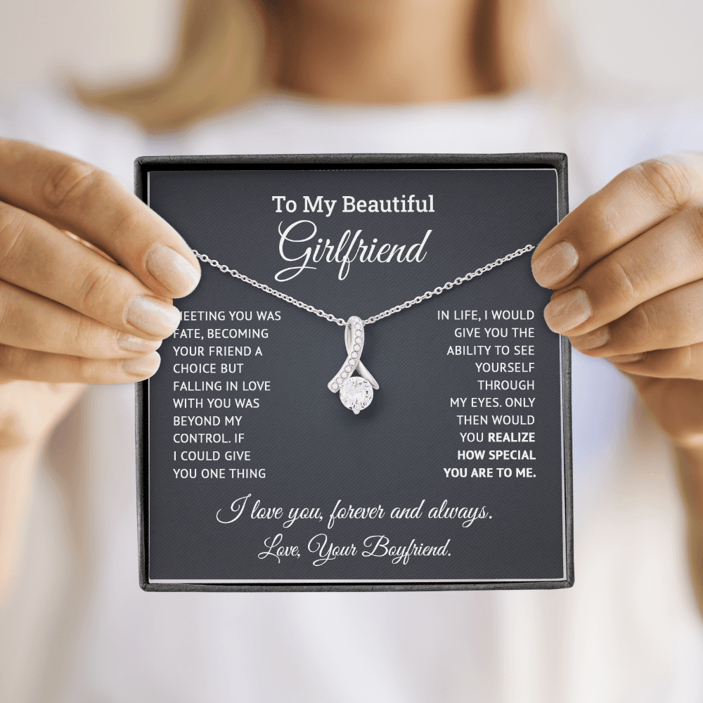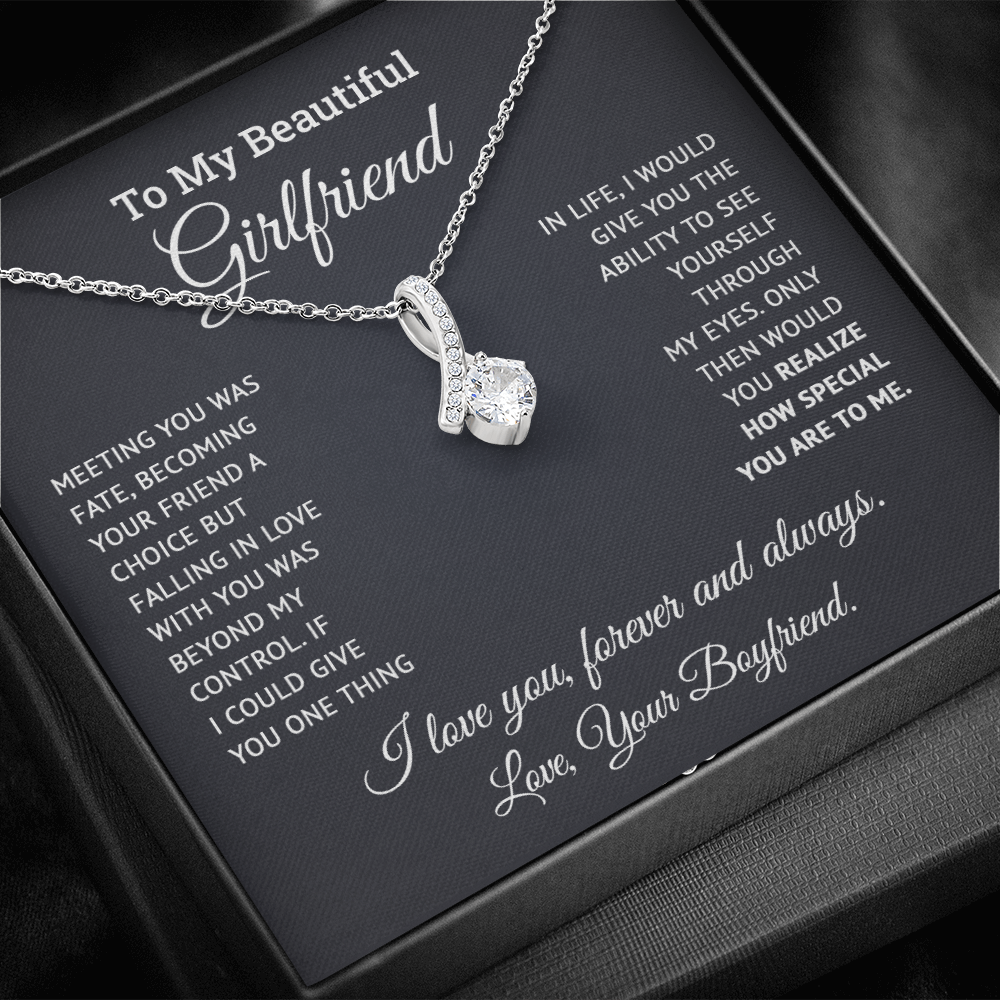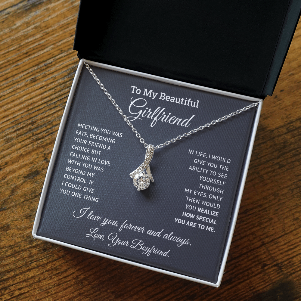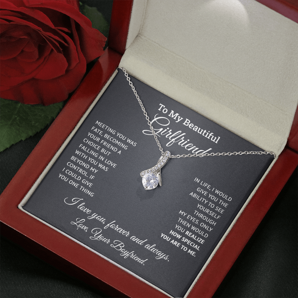 Melt her heart with this ALLURING BEAUTY necklace gift! The petite ribbon shaped pendant is finished with 14K white gold over stainless steel, and is embellished with dainty clear crystals surrounded by a sparkling 7mm round cut Cubic Zirconia.