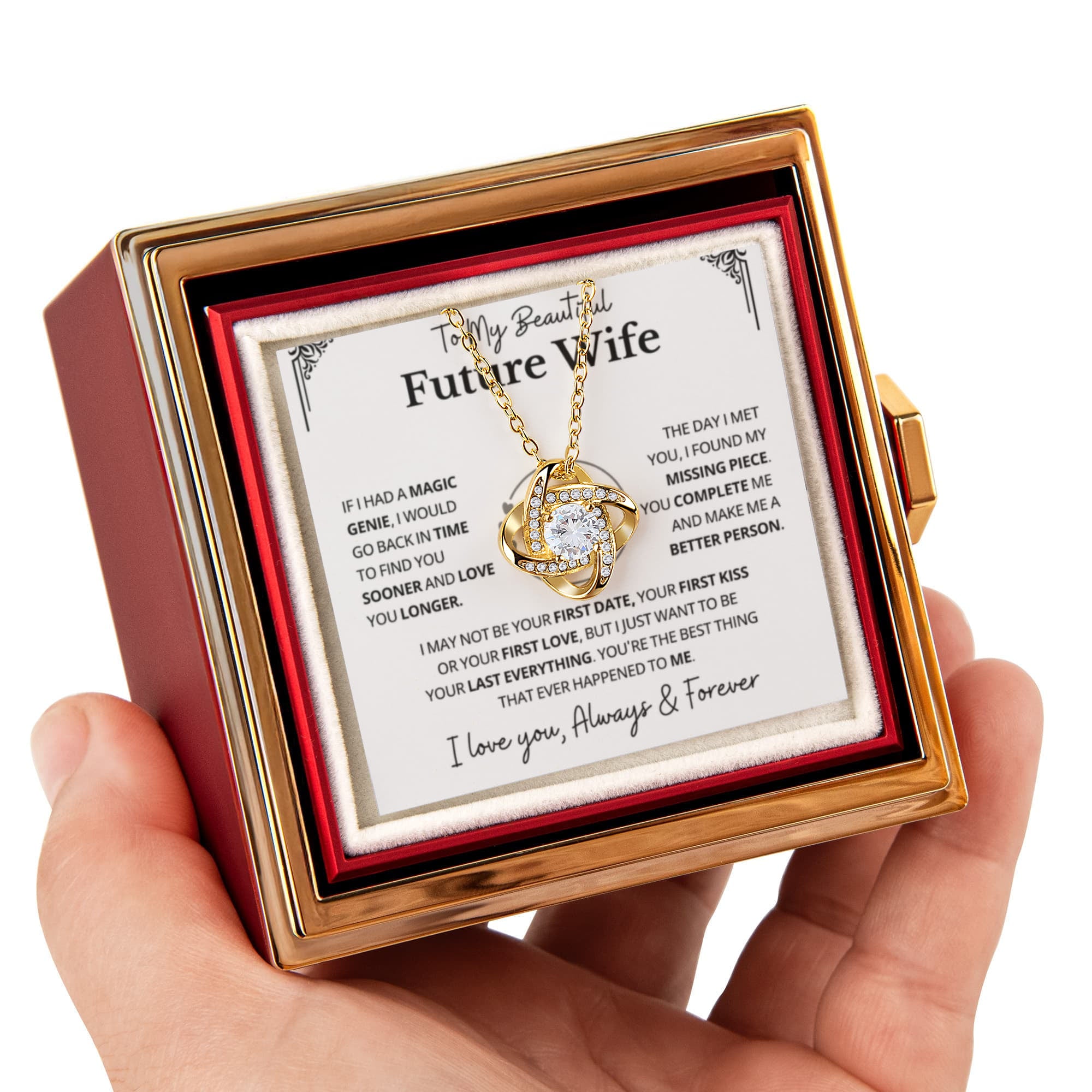 Imagine her reaction as she receives this beautiful Love Knot Necklace. Representing an unbreakable bond between two souls, this stunning pendant is adorned with premium cubic zirconia crystals, making it a timeless symbol of love and devotion. The luxurious box, featuring a meticulously preserved rose that never fades, adds an extra touch of love. With a simple turn of the gold knob, her breathtaking gift is revealed—making it the perfect sentimental gift for that special someone.