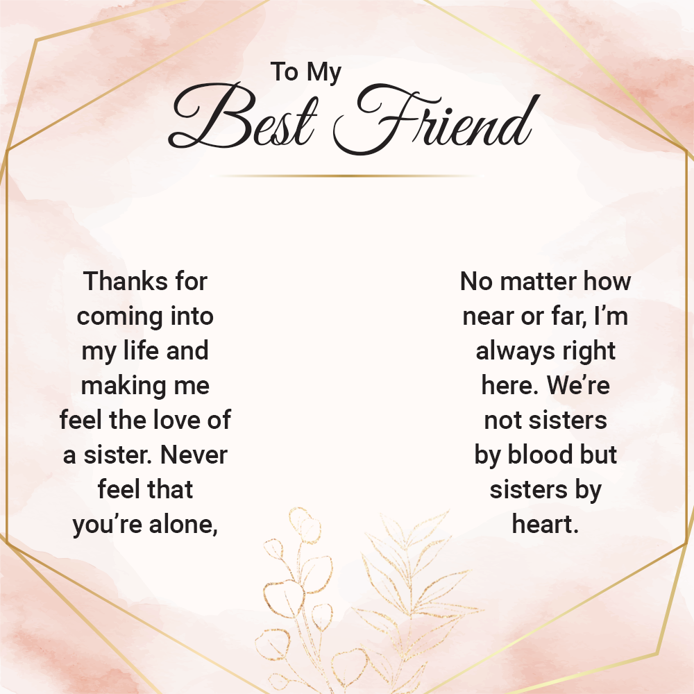 Express your gratitude with the Sisters by Heart Necklace, a heartfelt gift for your best friend. This meaningful jewelry symbolizes the deep connection you share, reminding her that distance doesn’t diminish your bond. Perfect for birthdays or just because, it's a lovely tribute to the sisterhood you cherish.