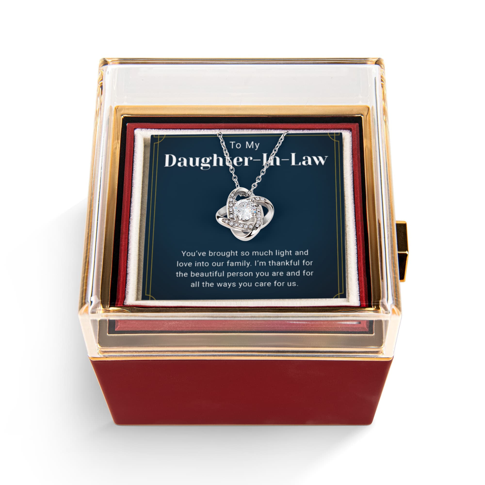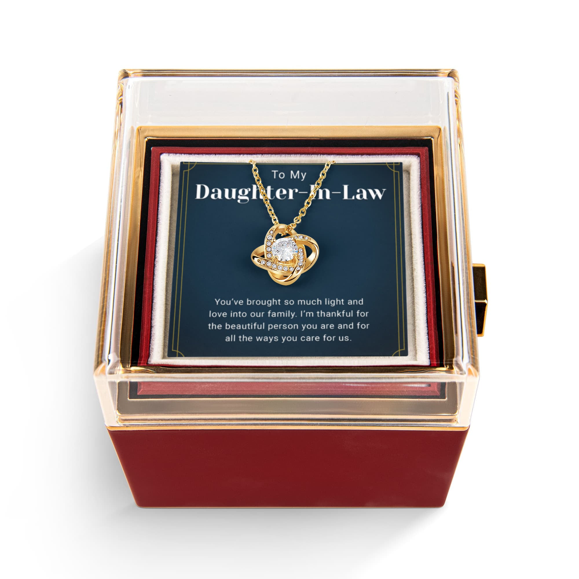 Imagine her reaction as she receives this beautiful Love Knot Necklace. Representing an unbreakable bond between two souls, this stunning pendant is adorned with premium cubic zirconia crystals, making it a timeless symbol of love and devotion. The luxurious box, featuring a meticulously preserved rose that never fades, adds an extra touch of love. With a simple turn of the gold knob, her breathtaking gift is revealed—making it the perfect sentimental gift for that special someone.