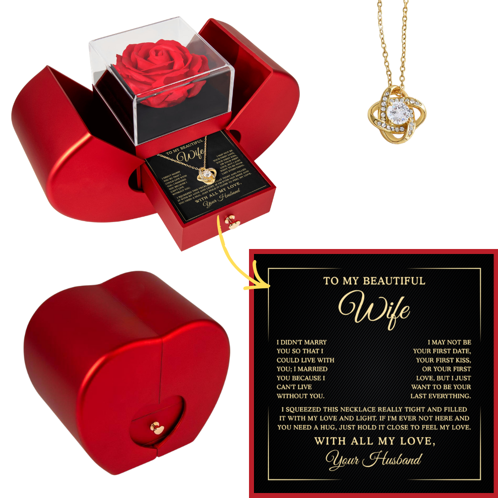 Create an unforgettable gifting experience, with our elegant Rose and Love knot Necklace Gift Set, complete with a festive greeting card. The everlasting Rose symbolizes eternal love, while the sparkling Love knot Necklace serves as the perfect token of your love. Ideal for birthdays, marriage proposals, Mother's Day, or any special occasion, this beautiful package is guaranteed to make your loved one feel truly cherished and appreciated.