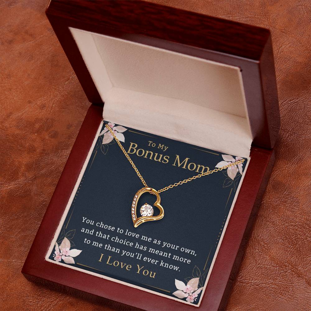 To my incredible bonus mom, your choice to love me as your own has changed my life in ways I can't fully express. This beautiful necklace makes for a perfect Mother’s Day or birthday gift, symbolizing our special bond. A timeless piece she'll cherish forever and a constant reminder of your love.