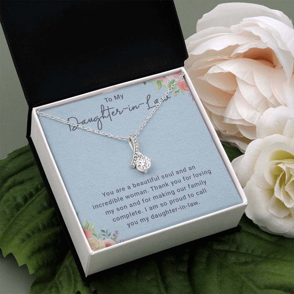 Give your daughter-in-law a gift she'll cherish forever. This alluring beauty necklace, available in 14k white or 18k yellow gold finish, is the ideal gift for birthdays, Christmas, or special occasions. Comes in a luxury gift box.
