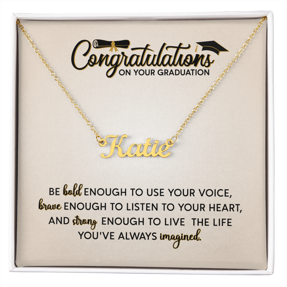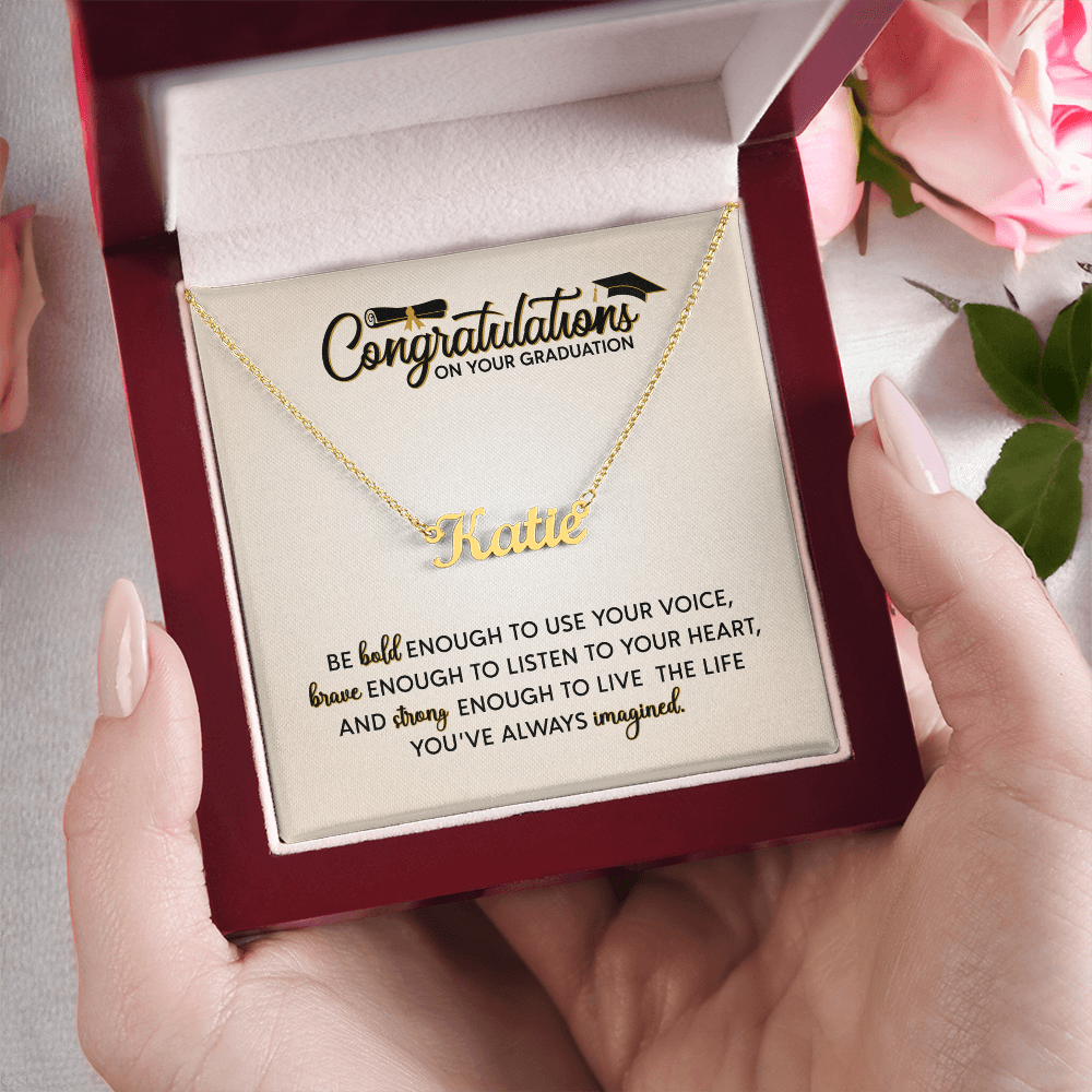 Celebrate graduation with a beautiful customized name necklace. Perfect for mothers, daughters, and graduates, this heartfelt jewelry gift captures memories that last a lifetime.