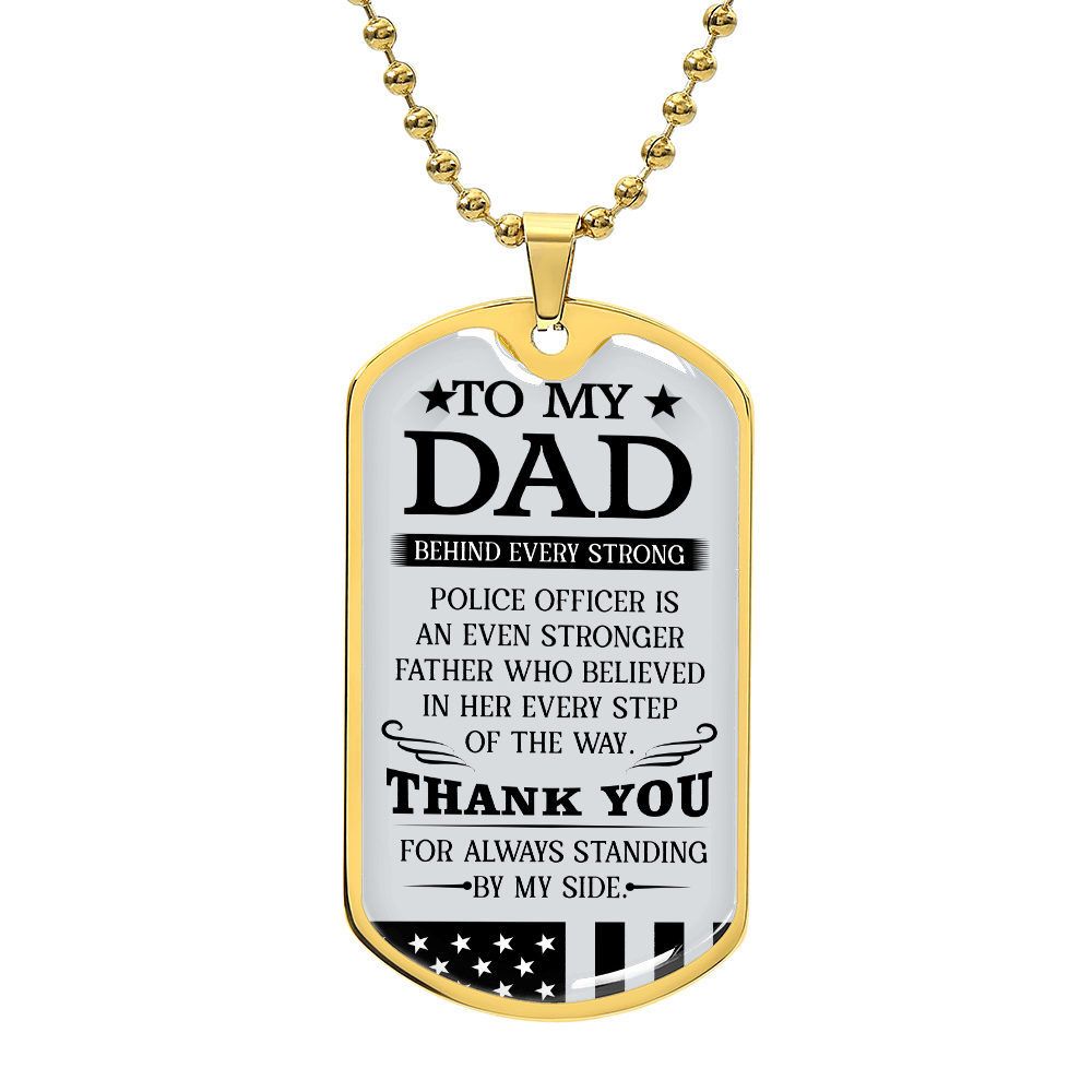 Show love for your Police Officer Dad with this dog tag necklace. A perfect jewelry gift from son or daughter for birthdays, Father’s Day, or to honor his dedication and service.