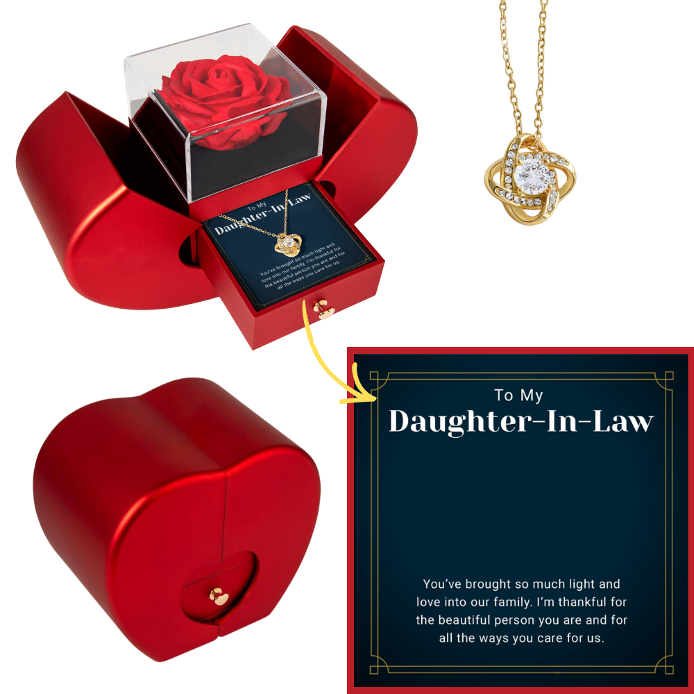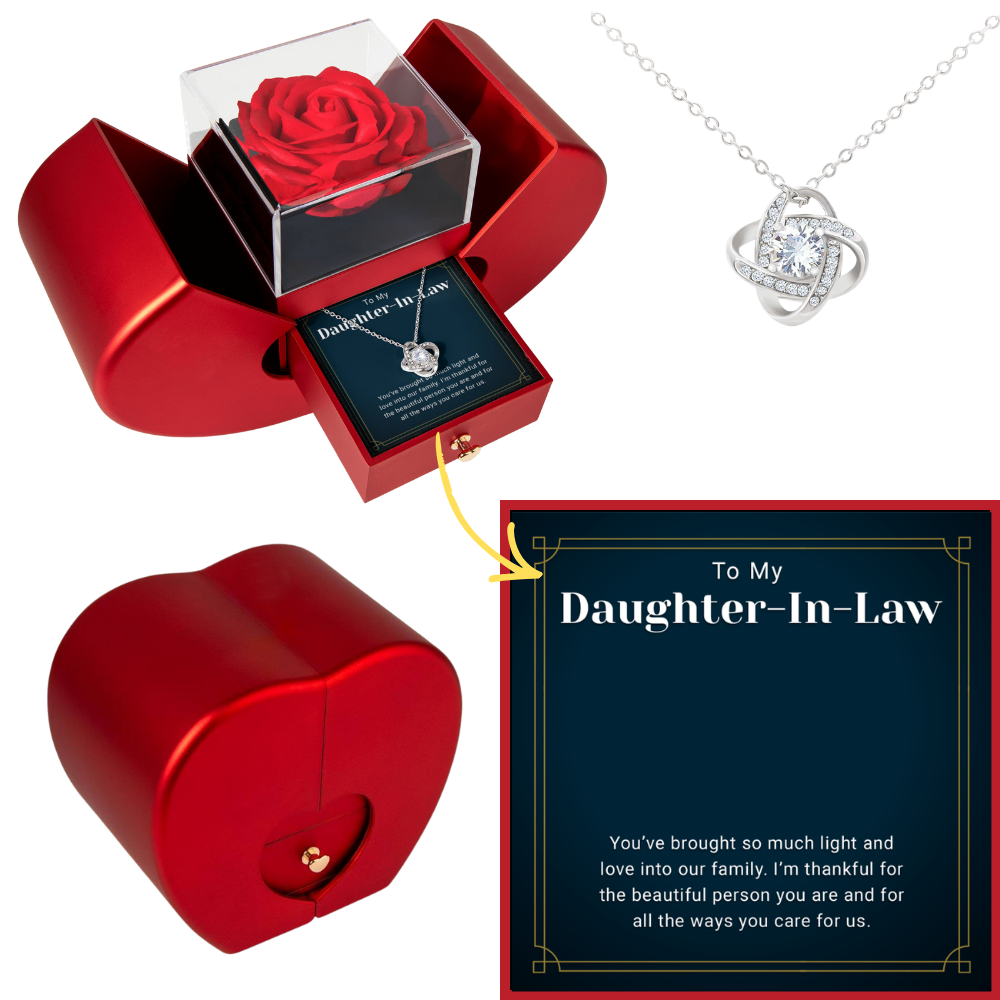Create an unforgettable gifting experience, with our elegant Rose and Love knot Necklace Gift Set, complete with a festive greeting card. The everlasting Rose symbolizes eternal love, while the sparkling Love knot Necklace serves as the perfect token of your love. Ideal for birthdays, marriage proposals, Mother's Day, or any special occasion, this beautiful package is guaranteed to make your loved one feel truly cherished and appreciated.