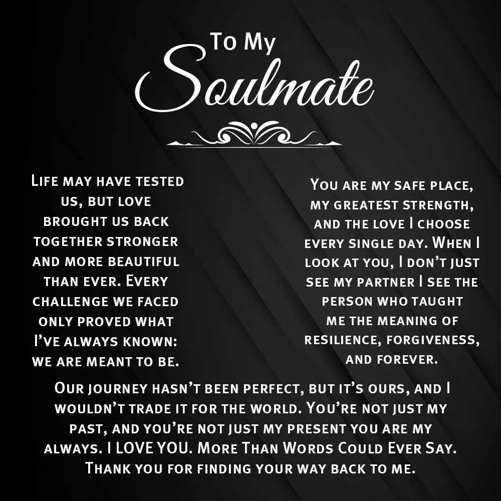 To My Soulmate, love has brought us back together stronger than ever. Through challenges and growth, we've proven that we are meant to be. You are my safe place, my strength, and the love I choose every day. Our journey, full of resilience, forgiveness, and forever, is a beautiful one. I love you more than words can say, and I’m grateful for you finding your way back to me.