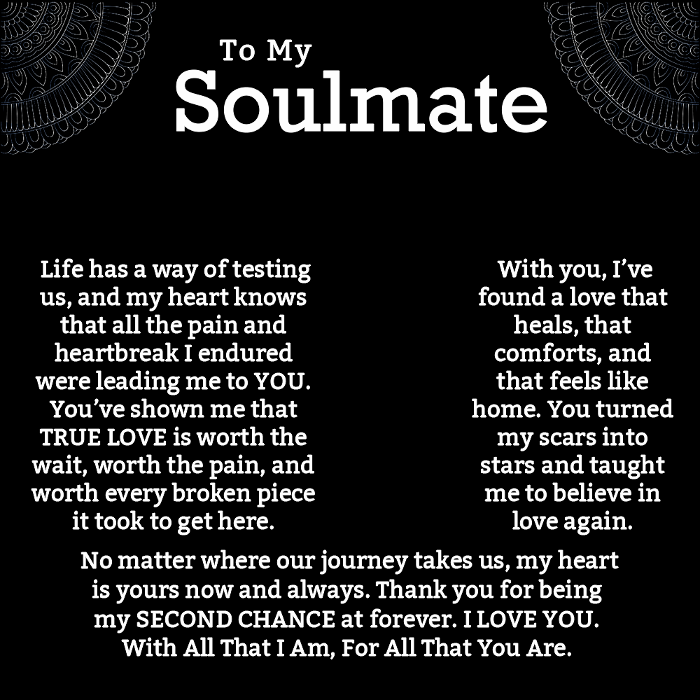 To My Soulmate, the pain and heartbreak were worth it because they led me to you. You’ve shown me that true love is worth the wait and the pain. With you, I’ve found healing, comfort, and a love that feels like home. Thank you for being my second chance at forever. I love you with all that I am, for all that you are.