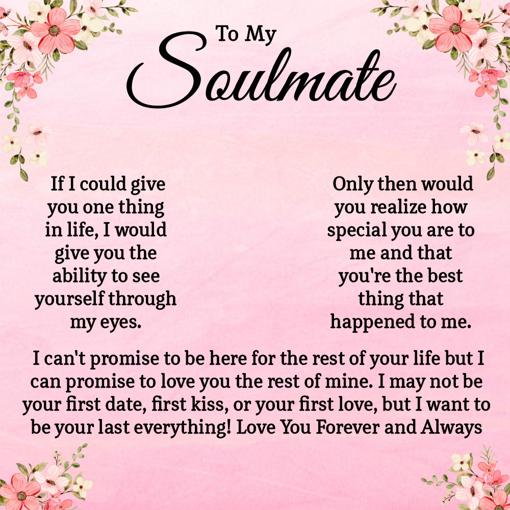 To My Soulmate, If I could give you one thing in life, I would give you the ability to see yourself through my eyes. Only then would you realize how special you are to me and that you're the best thing that ever happened to me. I can’t promise to be here for the rest of your life, but I can promise to love you for the rest of mine. I may not be your first date, first kiss, or first love, but I want to be your last everything. Love you forever and always.