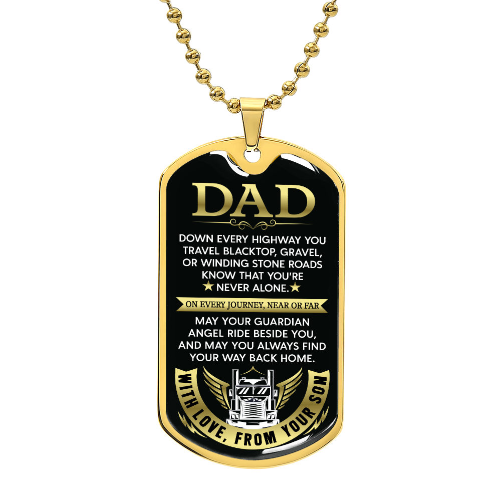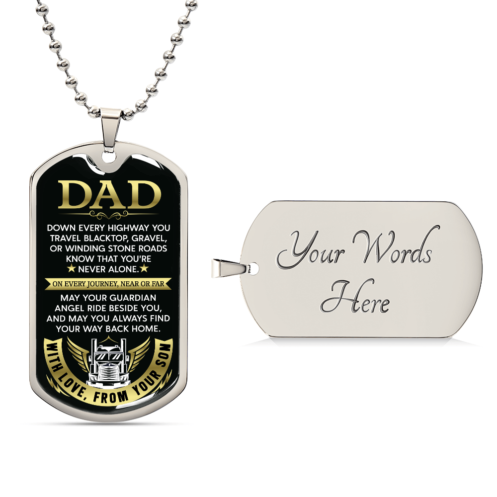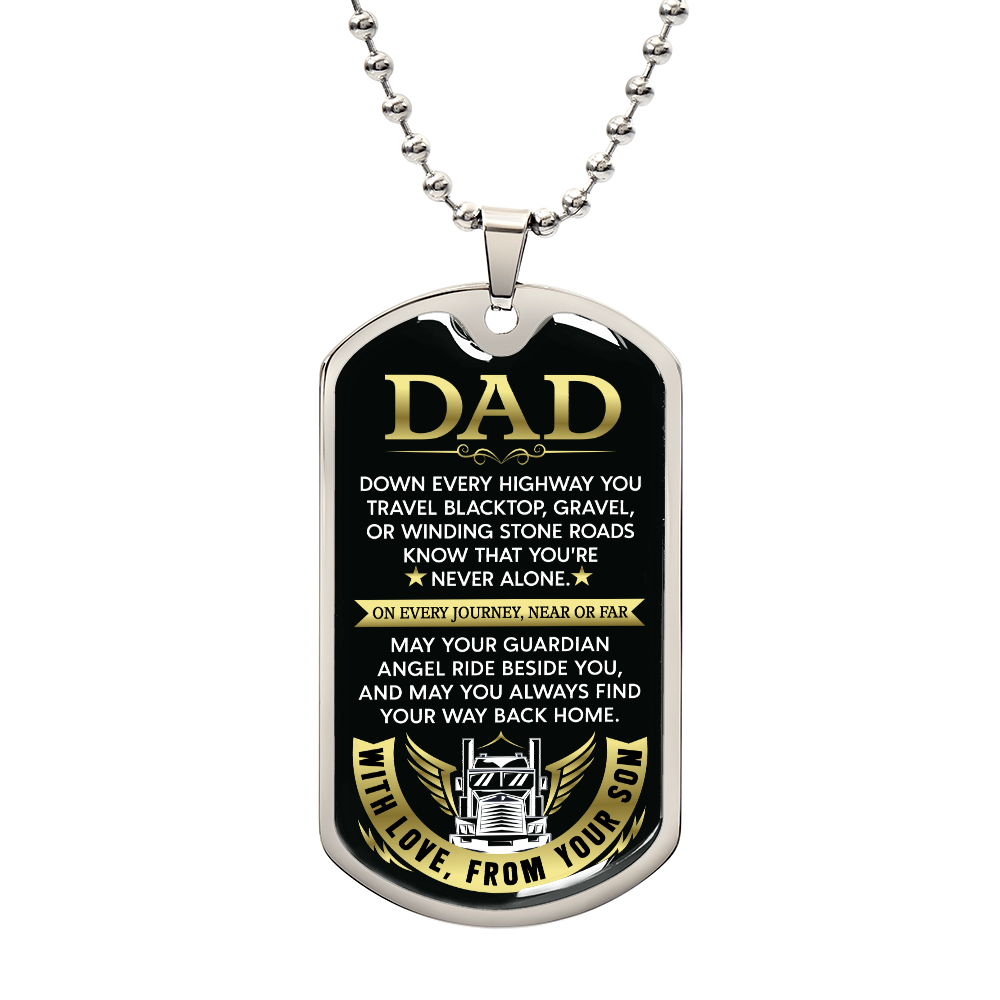 Surprise your Truck Driver Dad with this dog tag necklace. A unique jewelry gift from son or daughter for Father’s Day, birthdays, or to thank him for all his hard work on the road.