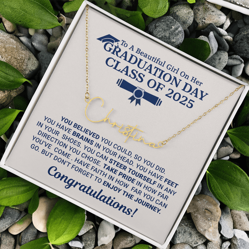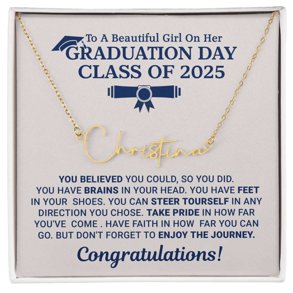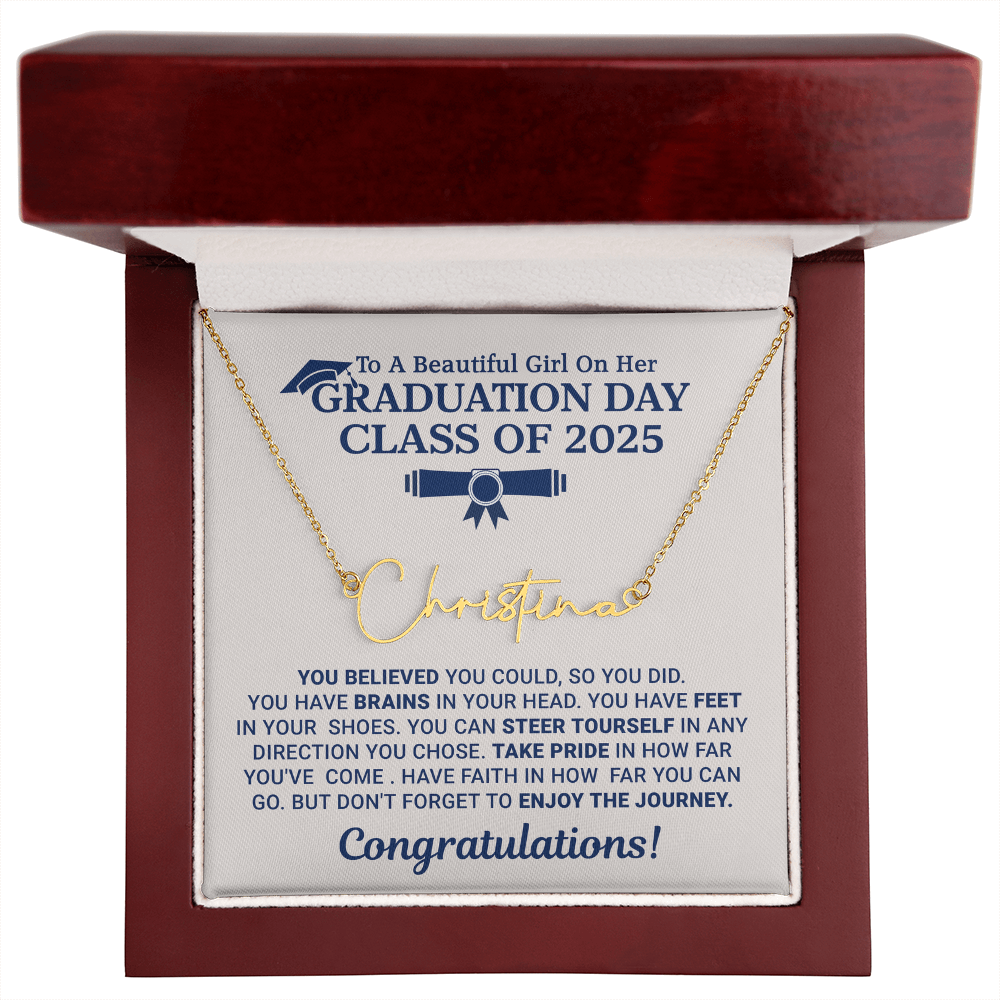 Celebrate graduation with a signature style personalized name necklace. A unique keepsake and a timeless gift idea for family members and proud graduates alike.