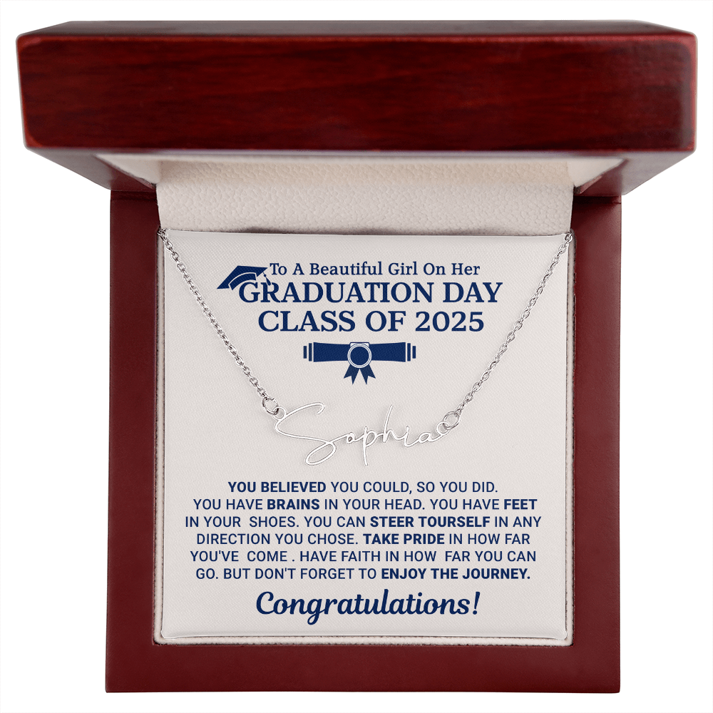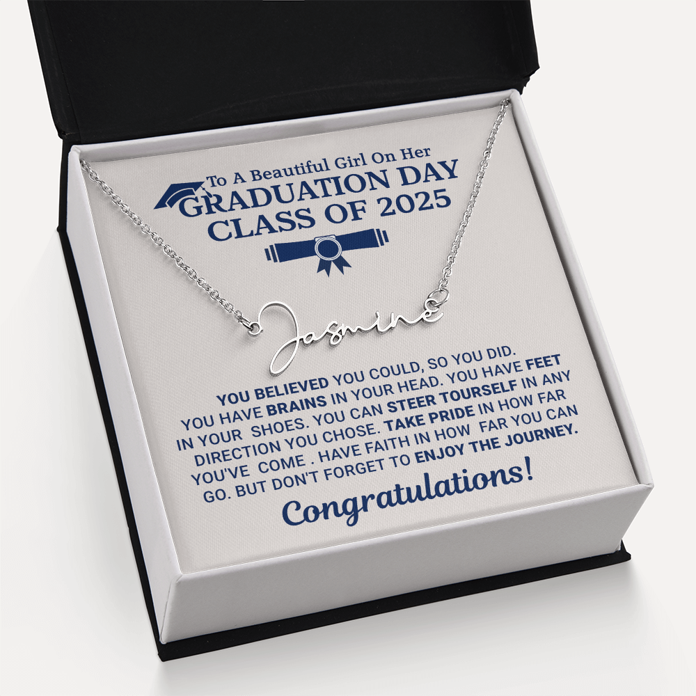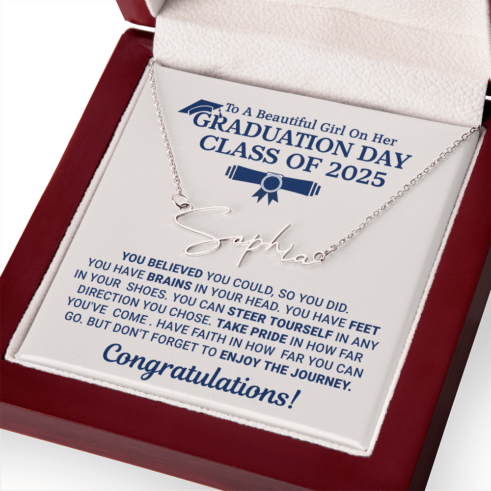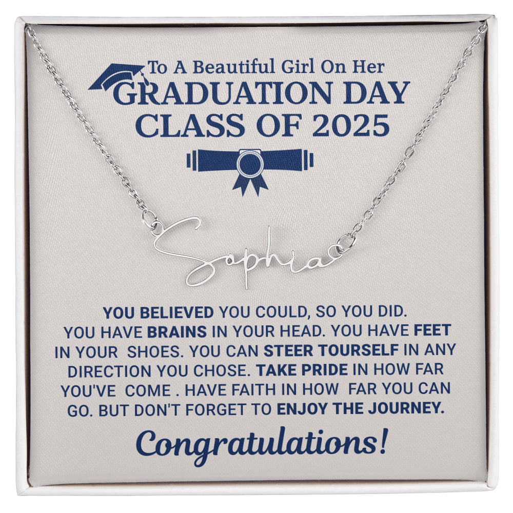 Celebrate graduation with a signature style personalized name necklace. A unique keepsake and a timeless gift idea for family members and proud graduates alike.