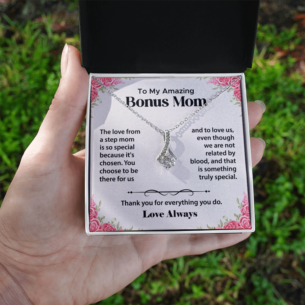 A sentimental Alluring Beauty Necklace, a heartfelt jewelry gift for Bonus Moms. A perfect way to express love and appreciation for her.