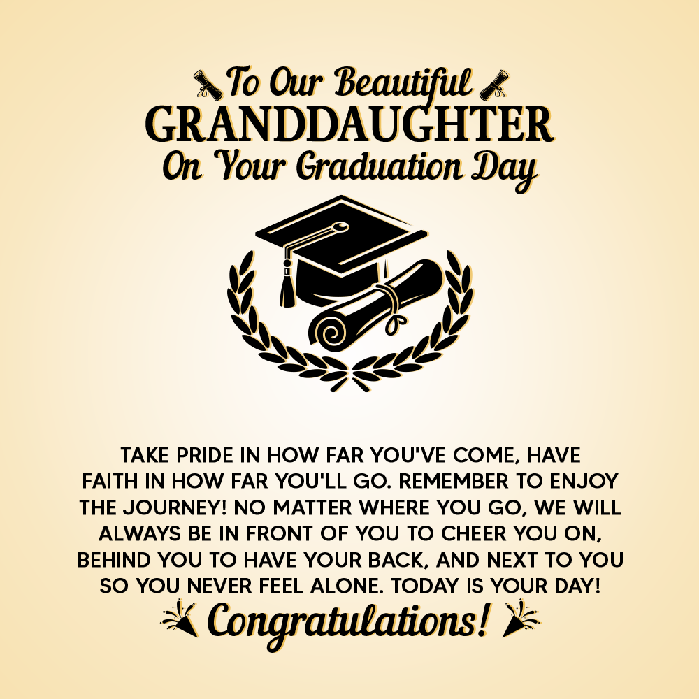 "To Our Beautiful GRANDDAUGHTER on your Graduation Day - Take pride in how far you've come, have faith in how far you'll go. Remember to enjoy the journey! No matter where you go, we will always be in front of you to cheer you on, behind you to have your back, and next to you so you never feel alone. Today is your day! Congratulations!"
