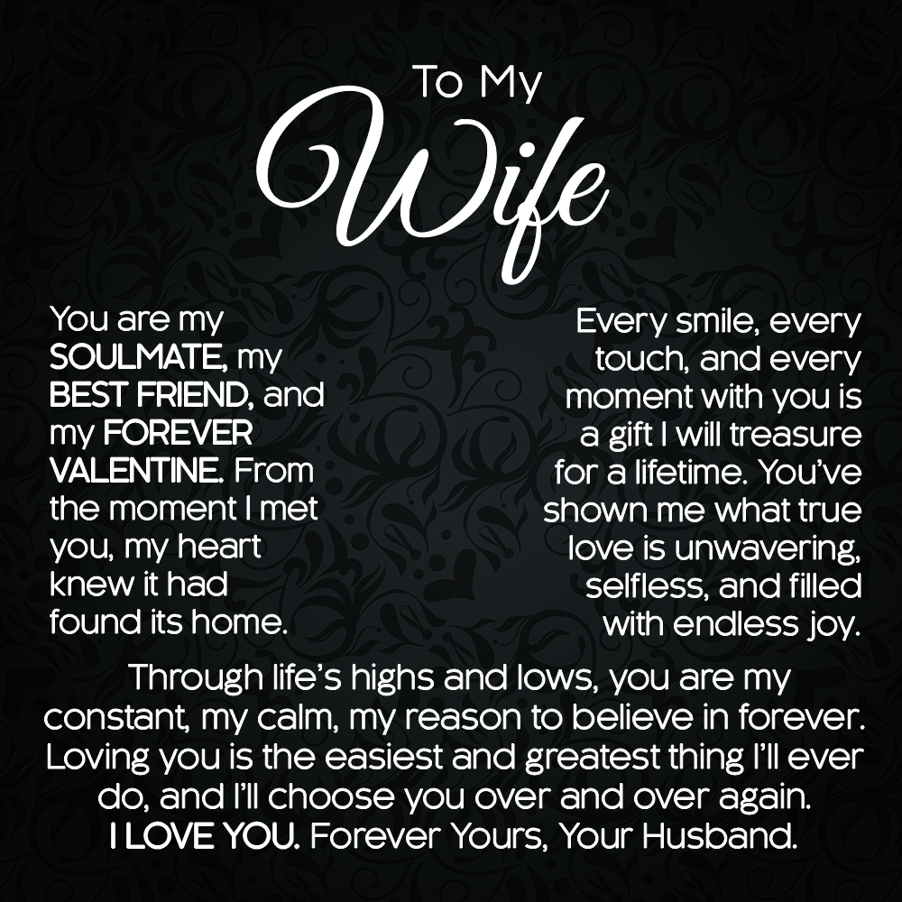 To my wife, you are my soulmate, my best friend, and my forever Valentine. From the moment I met you, my heart found its home. Every smile, touch, and moment with you is a treasure. Through life's highs and lows, you are my constant and my forever. I love you endlessly and choose you every day. Forever yours.
