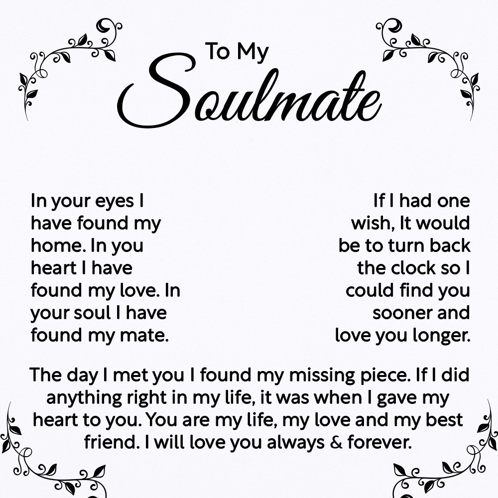To My Soulmate, In your eyes, I have found my home. In your heart, I have found my love. In your soul, I have found my mate. If I had one wish, it would be to turn back the clock so I could find you sooner and love you longer. You are my life, my love, and my best friend. I will love you always & forever. Interlocking Heart Necklace, a symbol of eternal love.