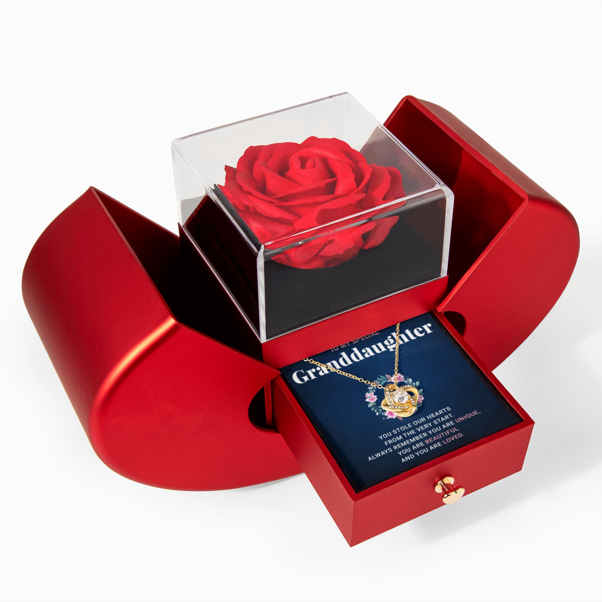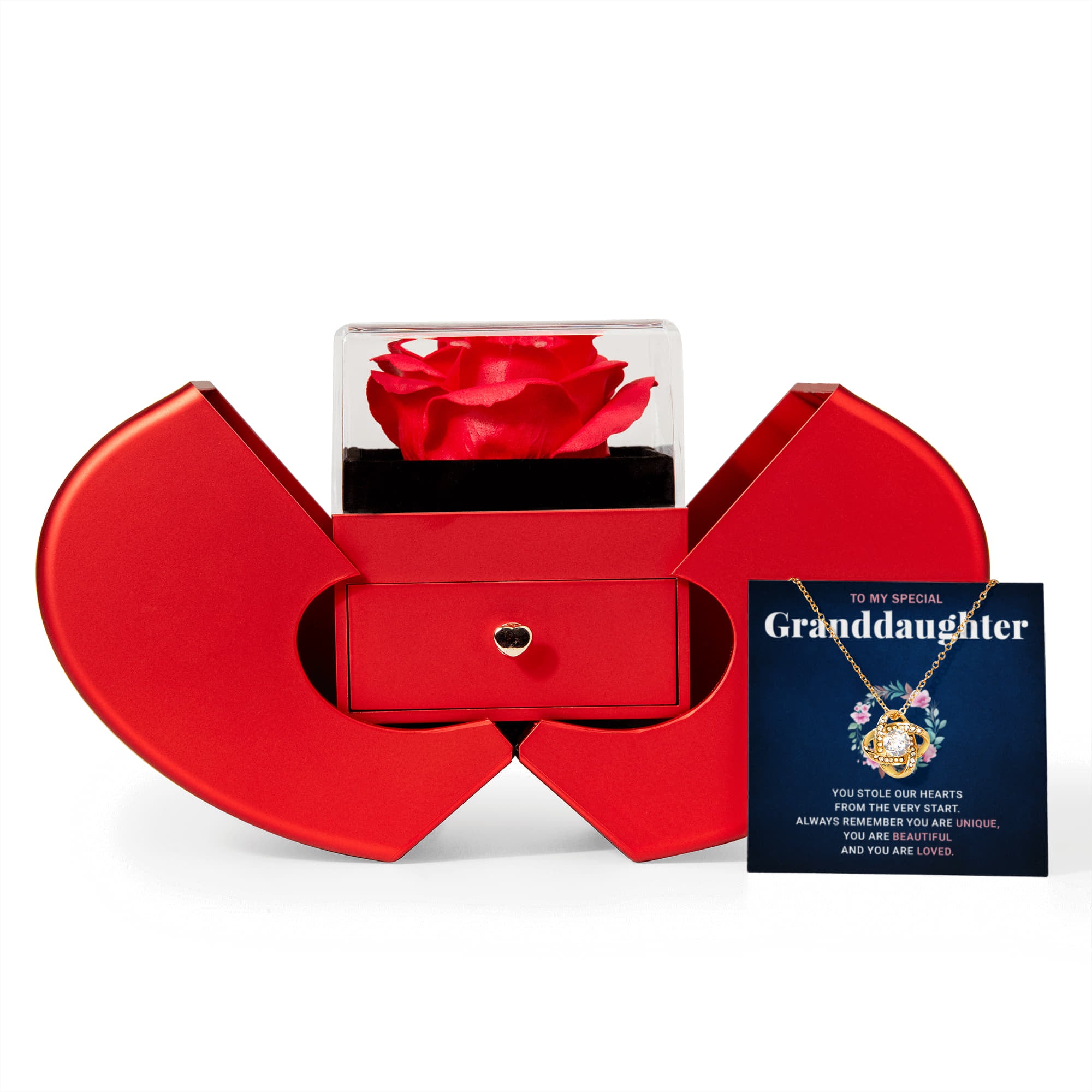 Create an unforgettable gifting experience, with our elegant Rose and Love knot Necklace Gift Set, complete with a festive greeting card. The everlasting Rose symbolizes eternal love, while the sparkling Love knot Necklace serves as the perfect token of your love. Ideal for birthdays, marriage proposals, Mother's Day, or any special occasion, this beautiful package is guaranteed to make your loved one feel truly cherished and appreciated.