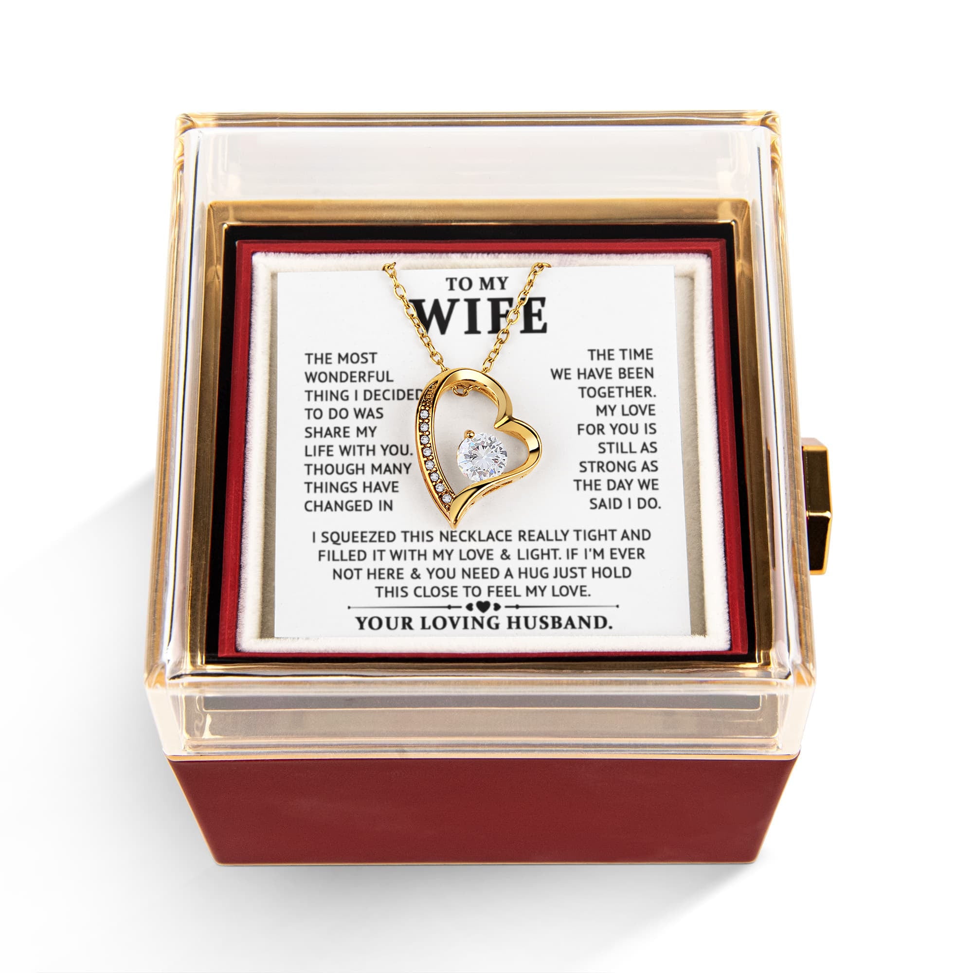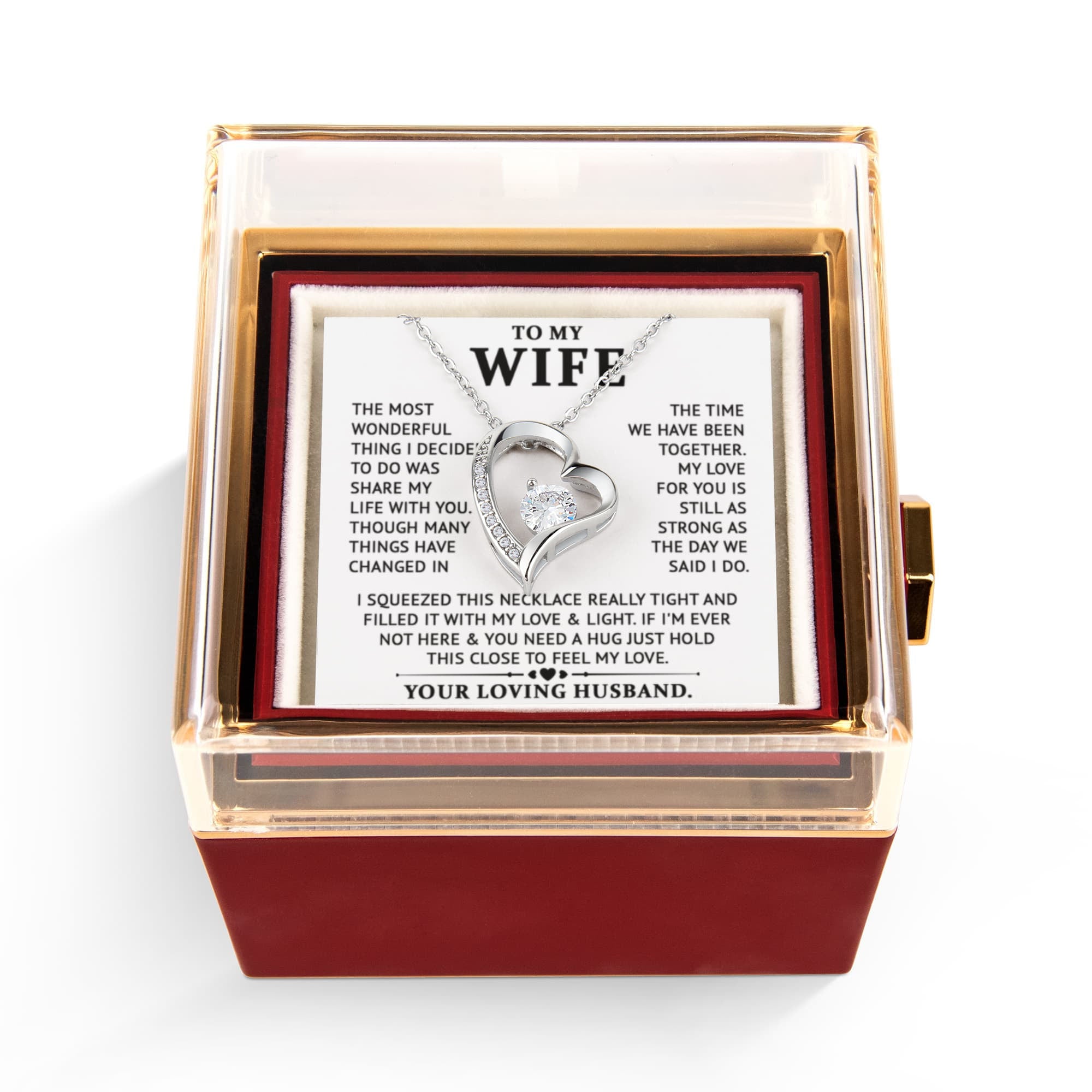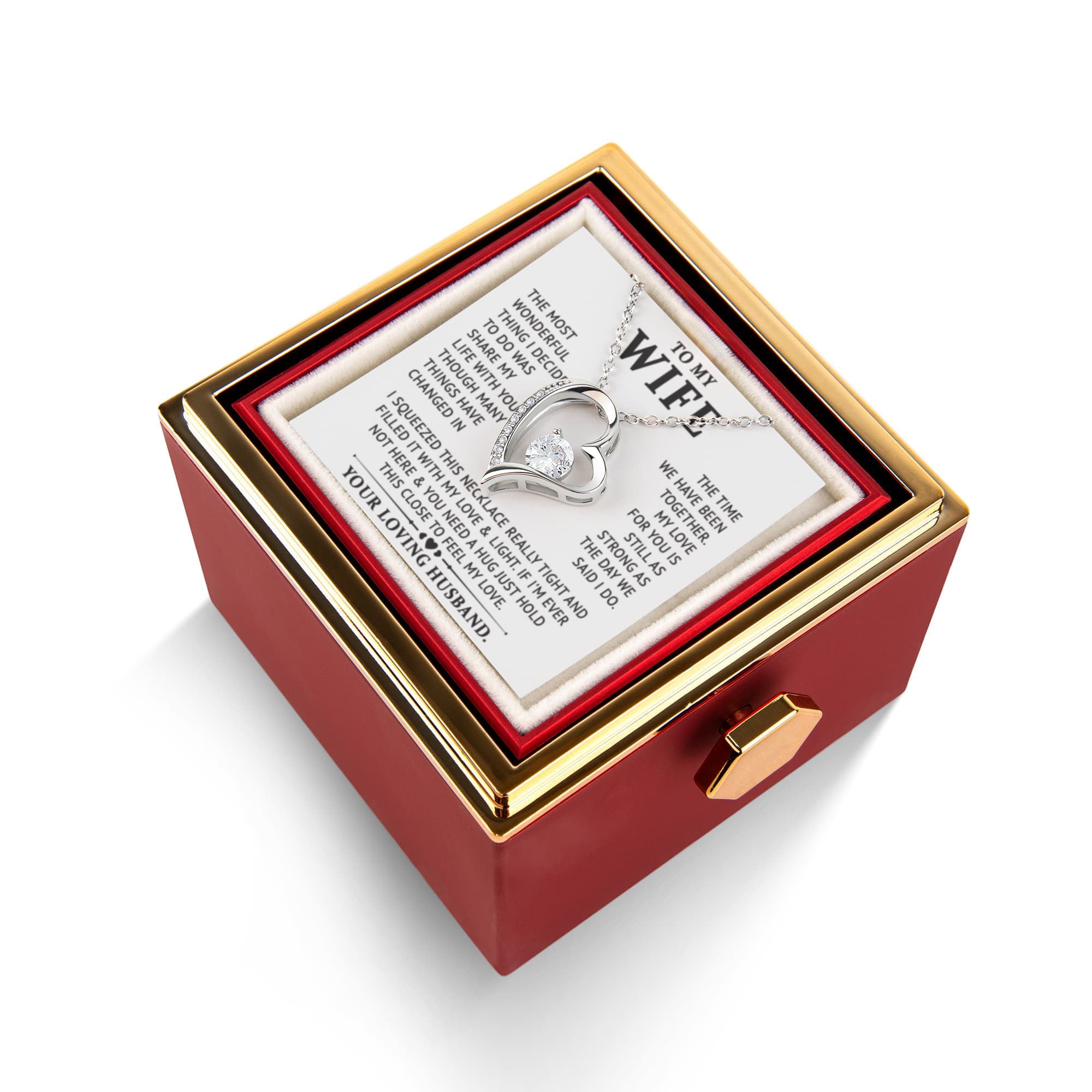 Imagine her reaction as she receives this beautiful Forever Love Necklace. The luxurious box, featuring a charming preserved rose that never fades, adds an extra touch of love. With a simple turn of the gold knob, her breathtaking gift is revealed—making it the perfect sentimental gift for that special someone.