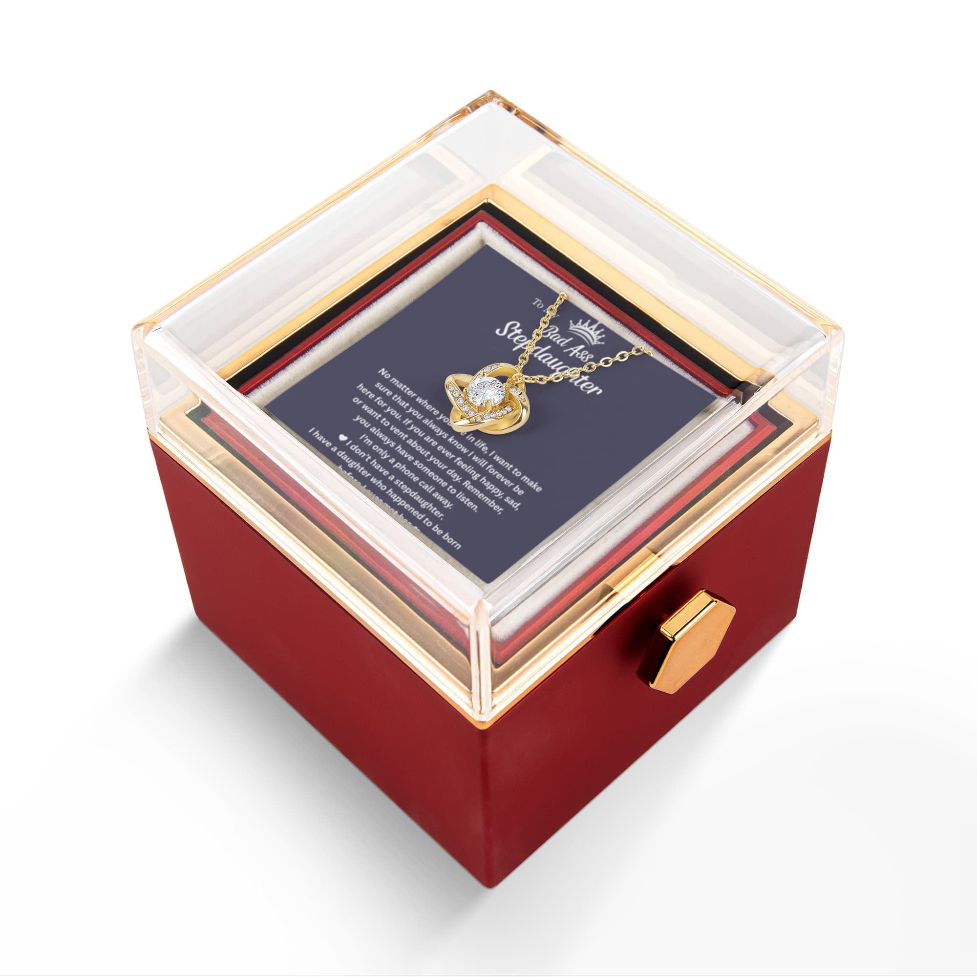 Imagine her reaction as she receives this beautiful Love Knot Necklace. Representing an unbreakable bond between two souls, this stunning pendant is adorned with premium cubic zirconia crystals, making it a timeless symbol of love and devotion. The luxurious box, featuring a meticulously preserved rose that never fades, adds an extra touch of love. With a simple turn of the gold knob, her breathtaking gift is revealed—making it the perfect sentimental gift for that special someone.