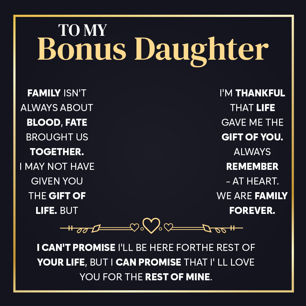 A heartfelt gift for your bonus daughter. This necklace and loving message celebrate the unique sparkle she brings to your family every day.