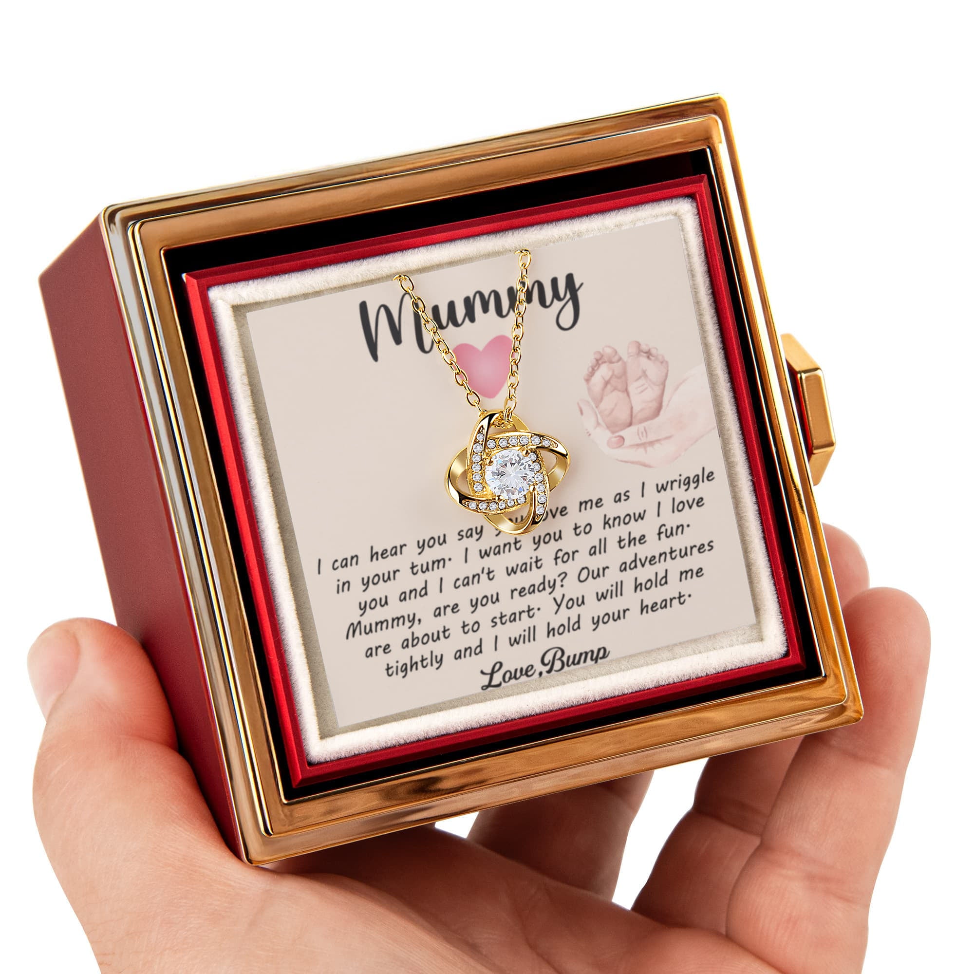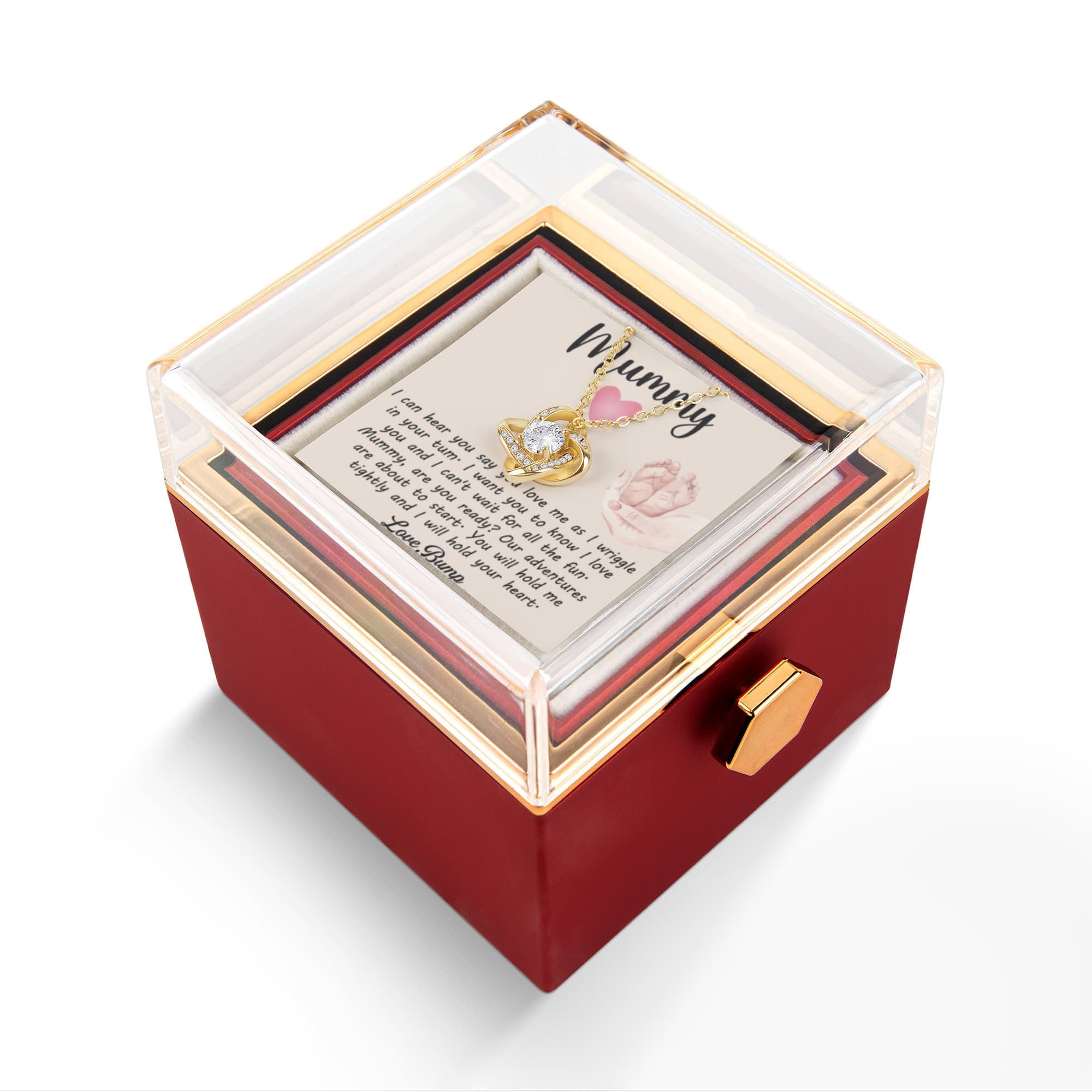 Imagine her reaction as she receives this beautiful Love Knot Necklace. Representing an unbreakable bond between two souls, this stunning pendant is adorned with premium cubic zirconia crystals, making it a timeless symbol of love and devotion. The luxurious box, featuring a meticulously preserved rose that never fades, adds an extra touch of love. With a simple turn of the gold knob, her breathtaking gift is revealed—making it the perfect sentimental gift for that special someone.