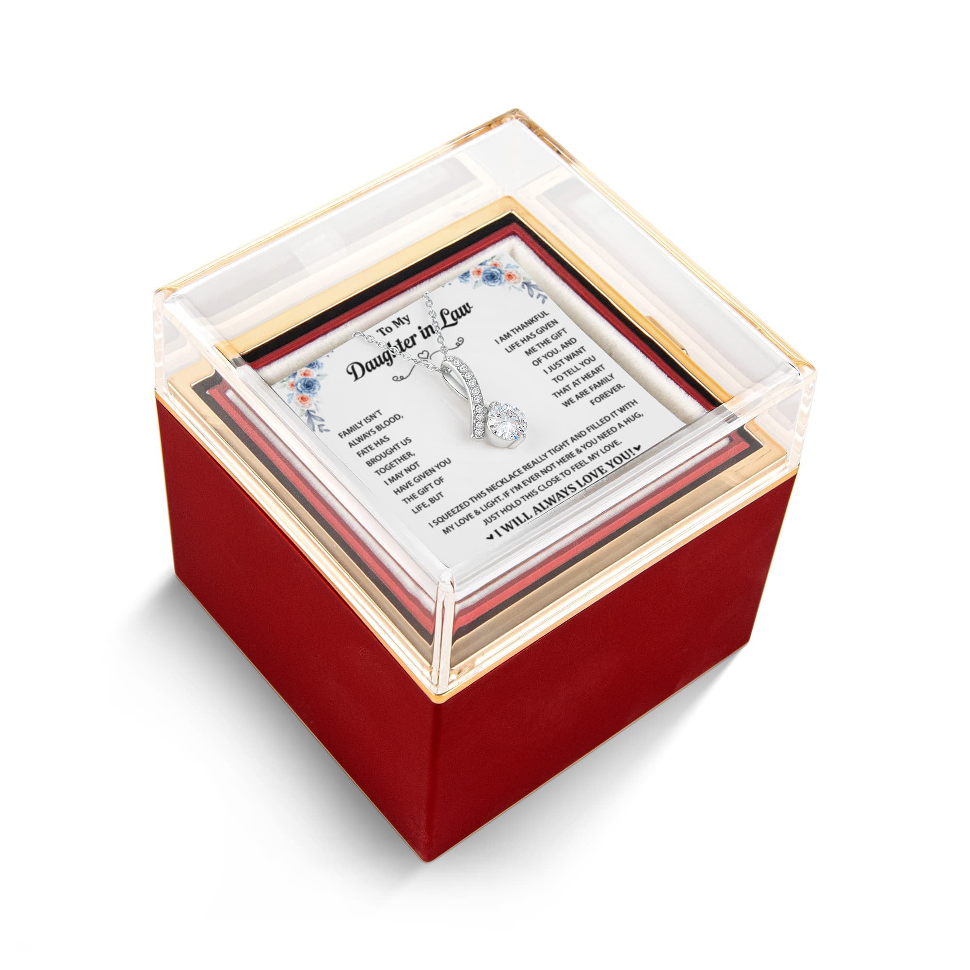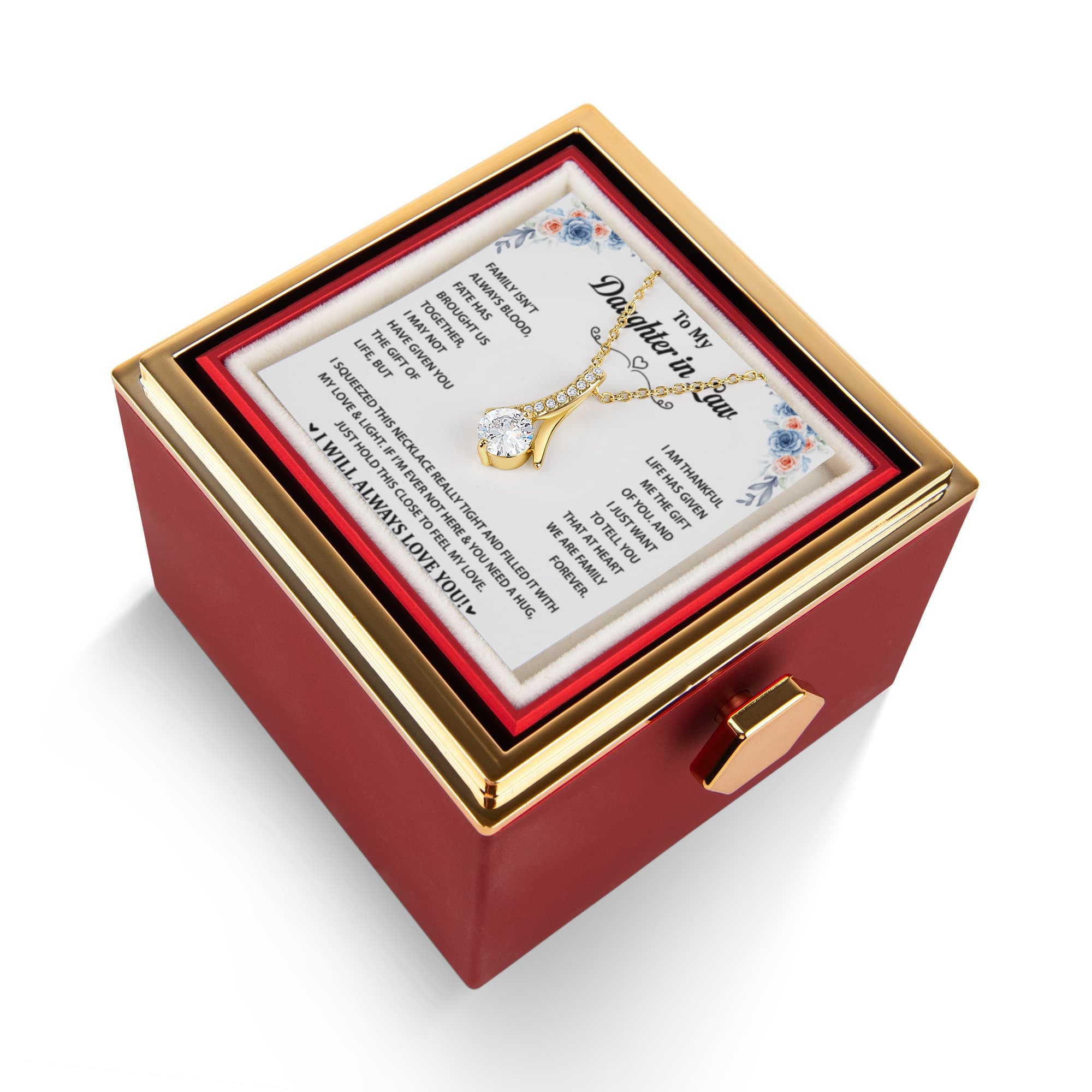 Imagine her reaction as she receives this beautiful Alluring Beauty Necklace. The luxurious box, featuring a charming preserved rose that never fades, adds an extra touch of love. With a simple turn of the gold knob, her breathtaking gift is revealed—making it the perfect sentimental gift for that special someone.