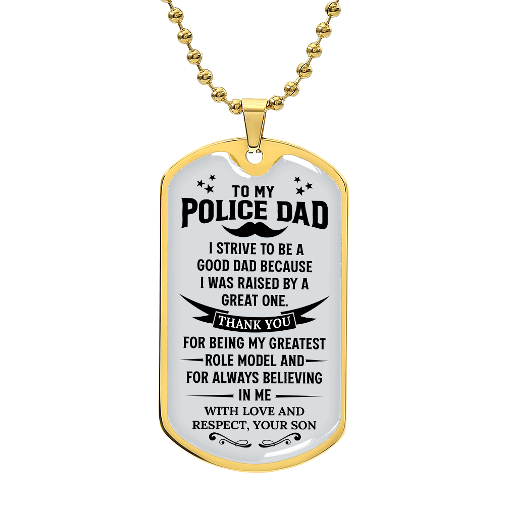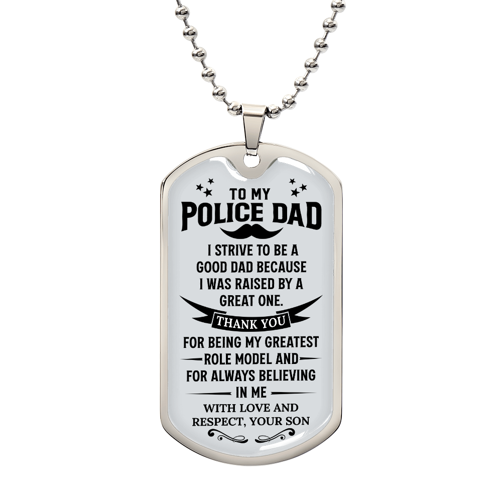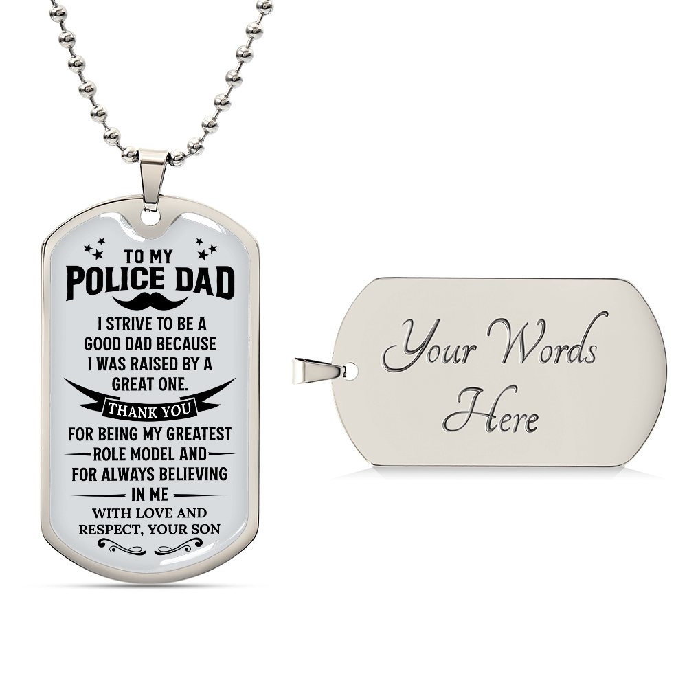 Celebrate the best Police Officer Dad with this meaningful dog tag necklace. The ideal jewelry gift from son or daughter for Father’s Day, birthdays, or retirement milestones.