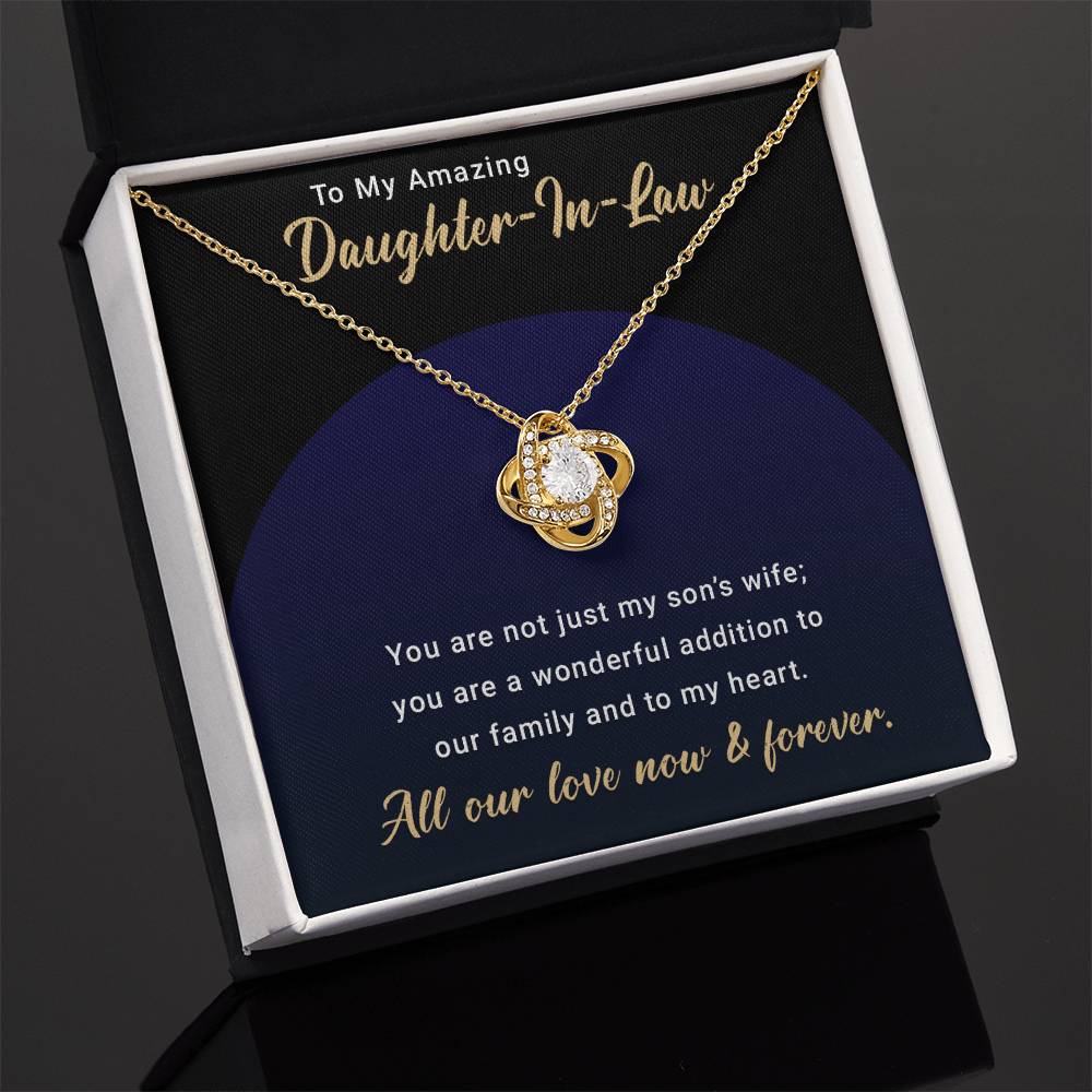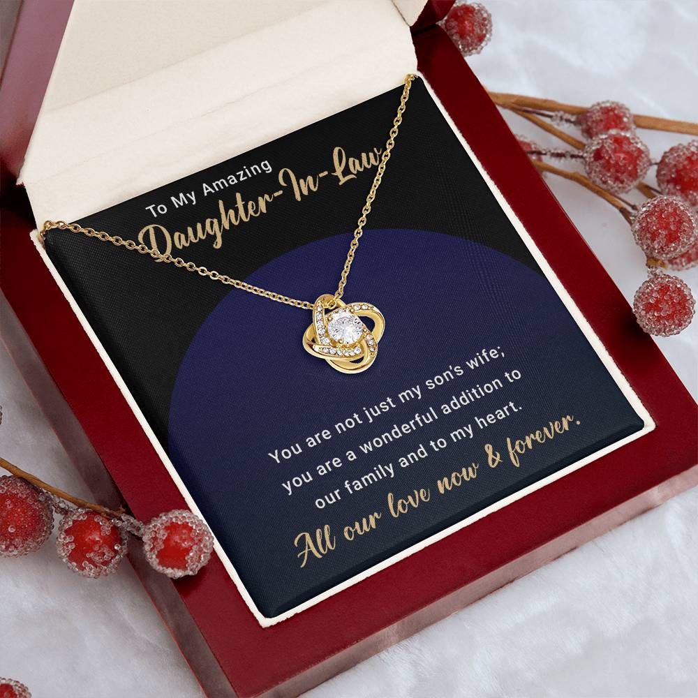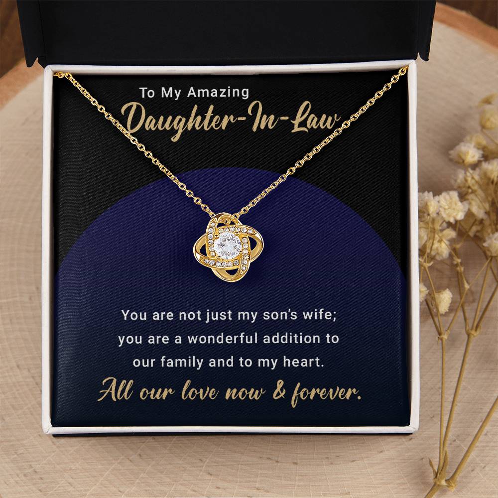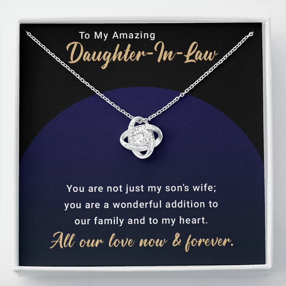 Love Knot Necklace for Daughter-in-Law – The perfect gift from mother-in-law for Christmas, birthdays, or her wedding day. Features a stunning cubic zirconia stone with a 14k or 18k gold finish. Comes in a gift box.