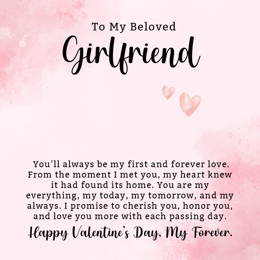 Show your beloved girlfriend how much she means to you this Valentine’s Day with a romantic message that celebrates your unbreakable bond. From promising to cherish her always to expressing how she’s your everything, this heartfelt note is the perfect way to say "I love you" forever.