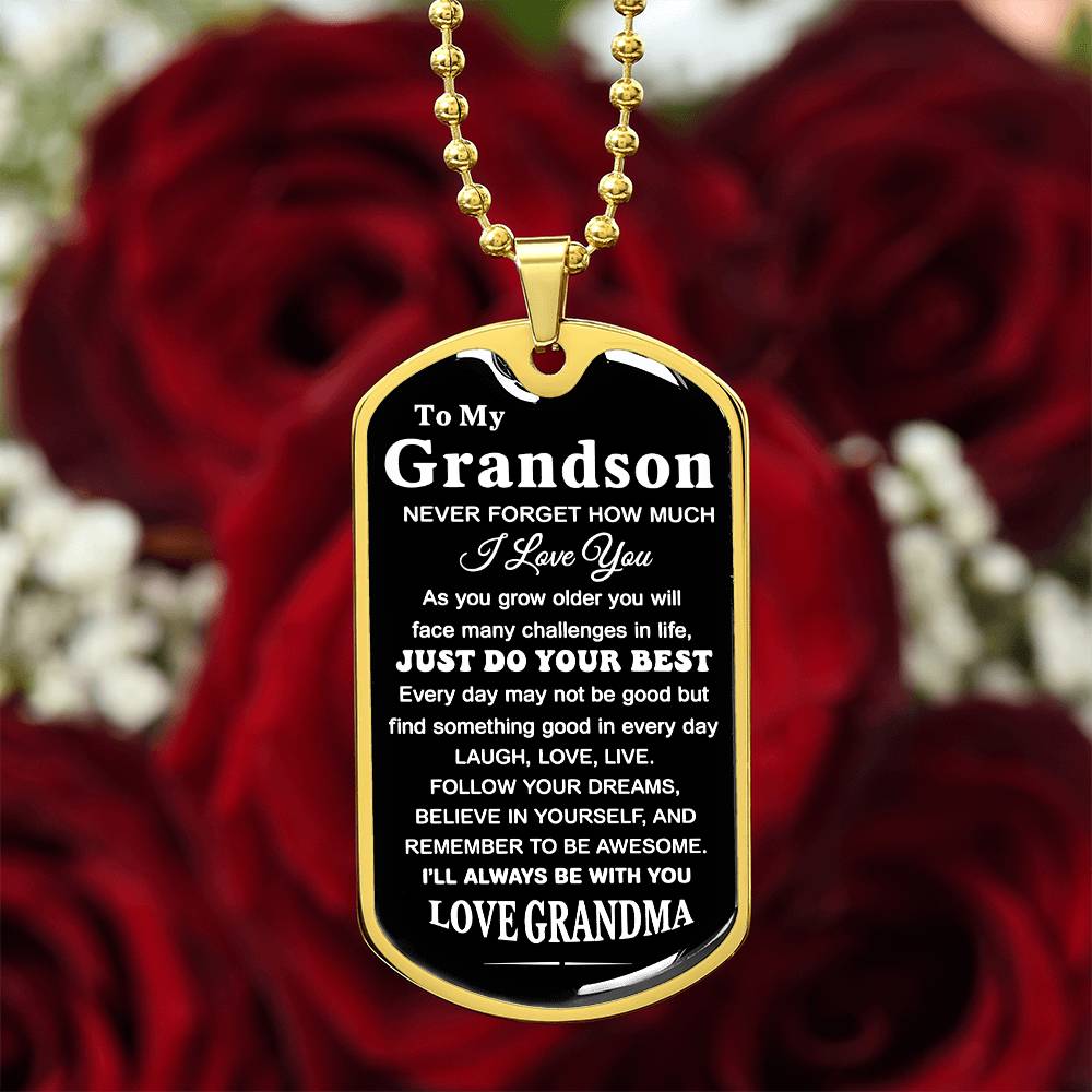 Gift your grandson a unique 'To My Grandson' dog tag necklace from Grandma. Ideal for birthdays or Christmas, this personalized accessory combines style and sentiment, ensuring he carries your love and encouragement wherever he goes.