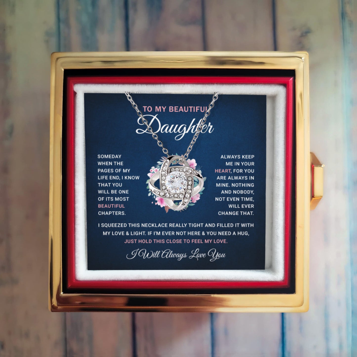 Celebrate Mother’s Day with this beautiful Love Knot Necklace in a rose box. A heartfelt gift from Mom and Dad, symbolizing endless love for your daughter.