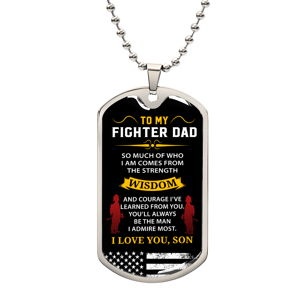 Celebrate your brave Firefighter Dad with this custom dog tag necklace. A perfect gift from son or daughter for Father’s Day, birthdays, or to honor his heroic dedication.