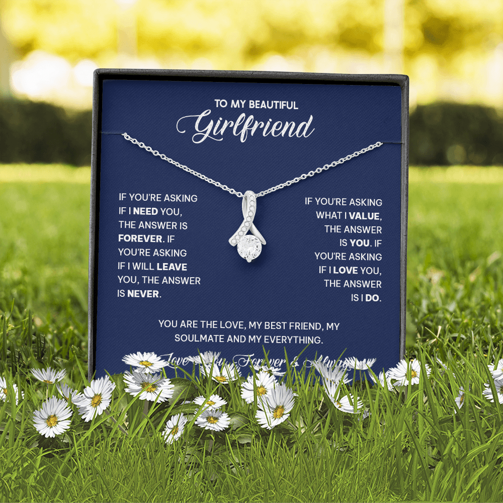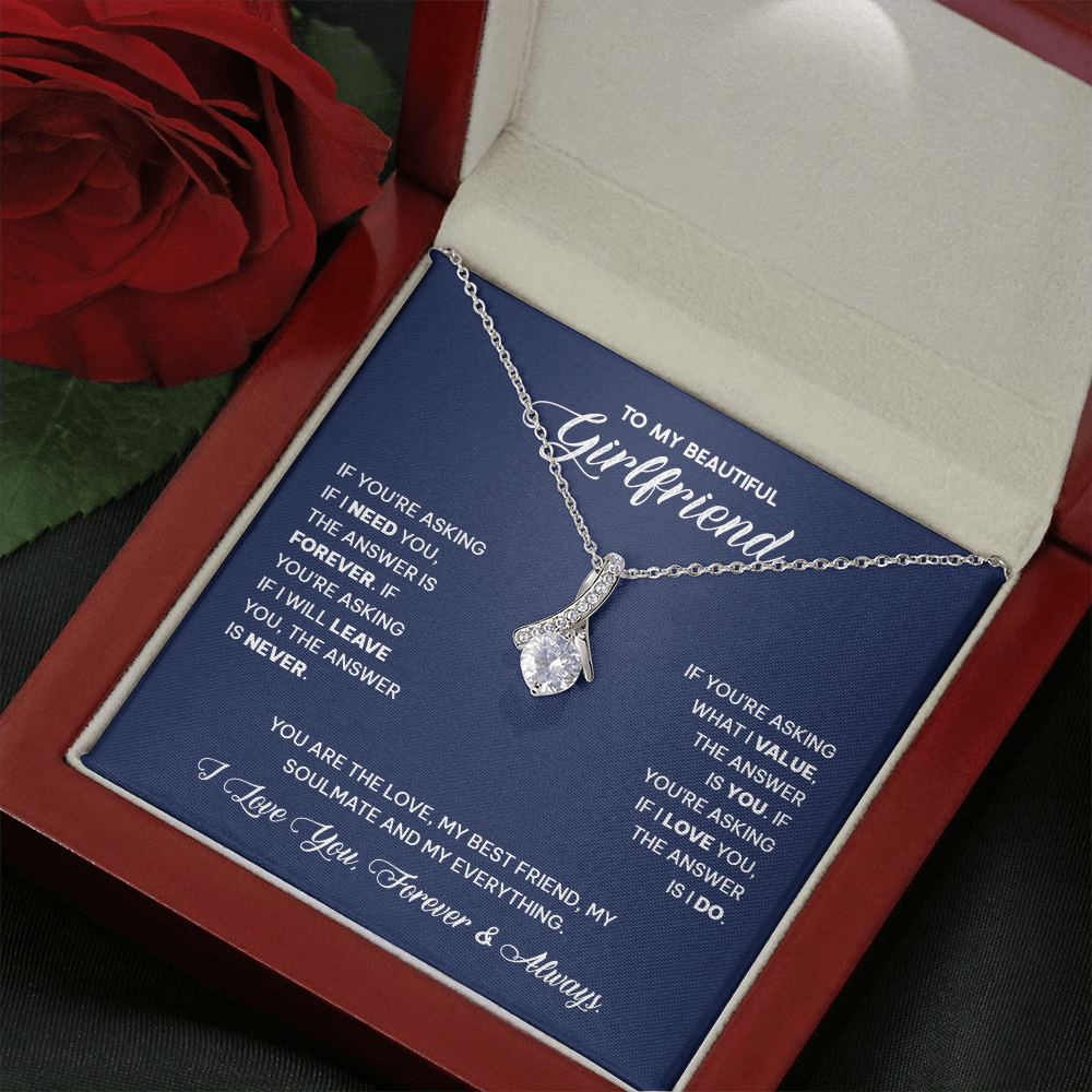 Melt her heart with this ALLURING BEAUTY necklace gift! The petite ribbon shaped pendant is finished with 14K white gold over stainless steel, and is embellished with dainty clear crystals surrounded by a sparkling 7mm round cut Cubic Zirconia.