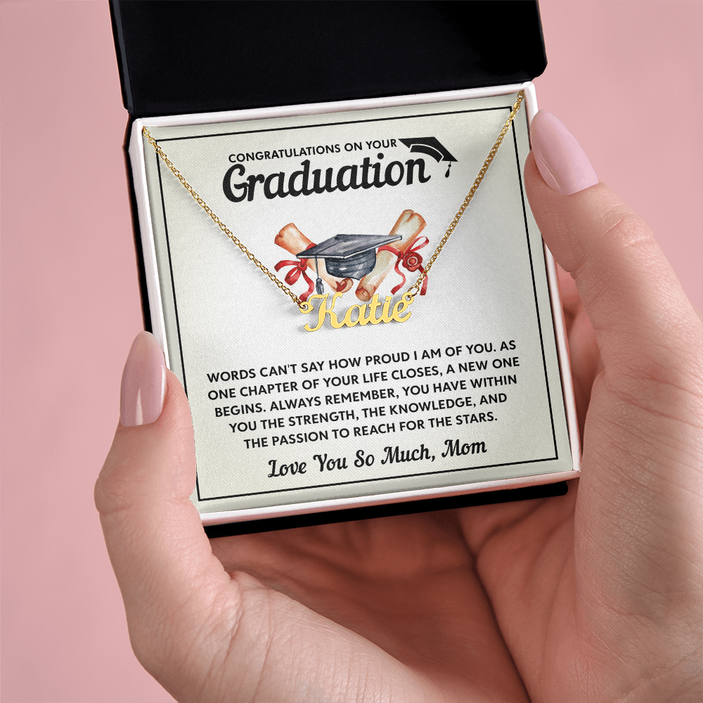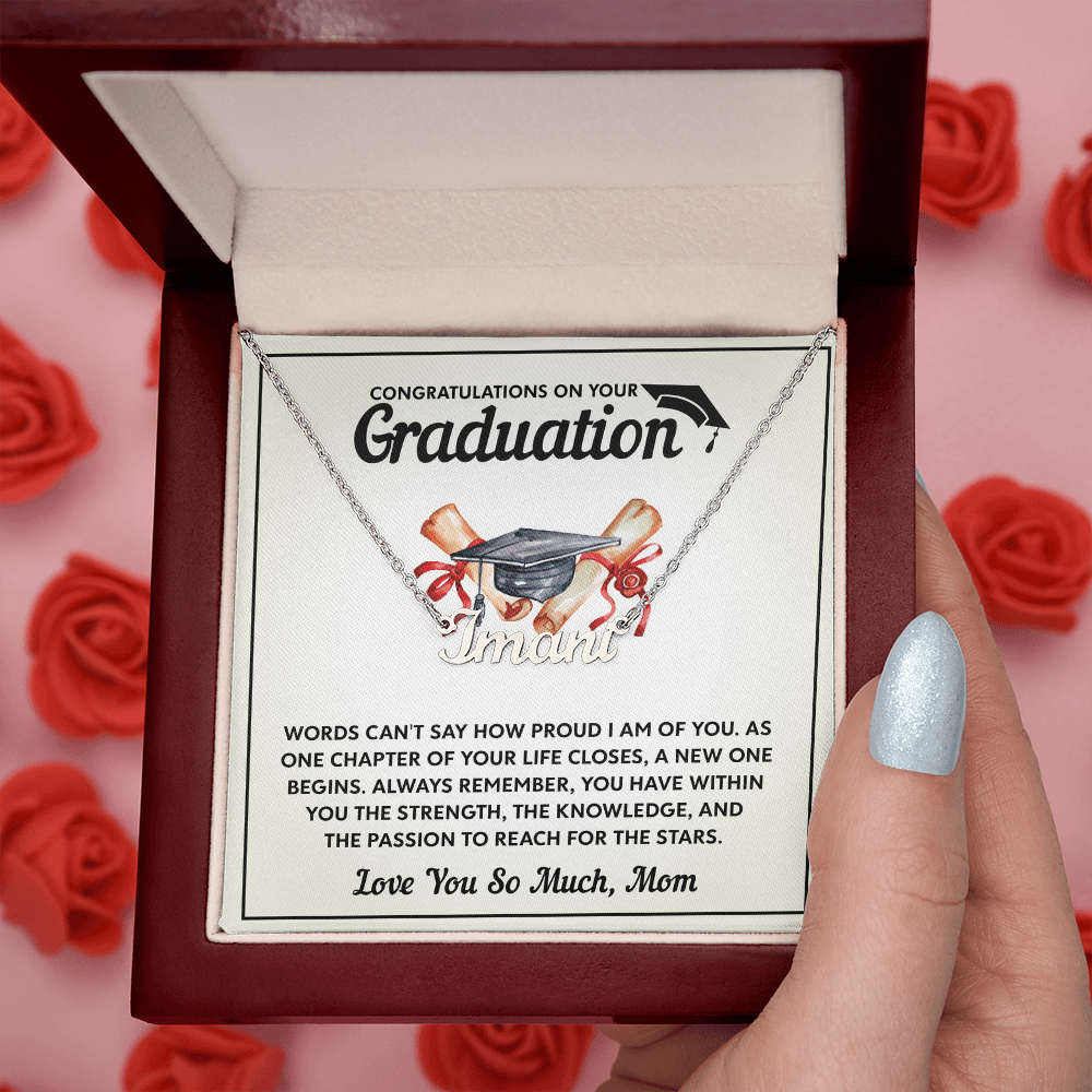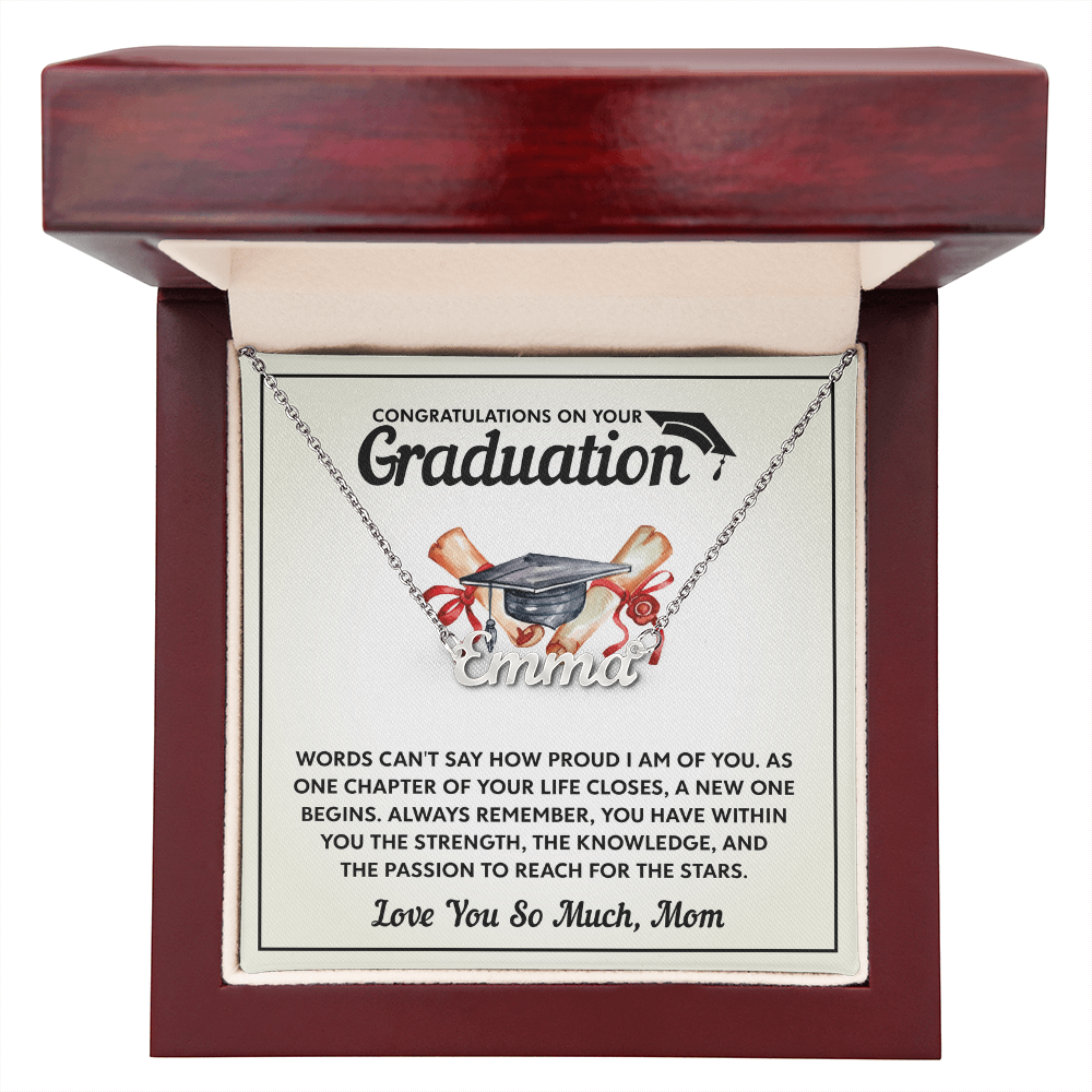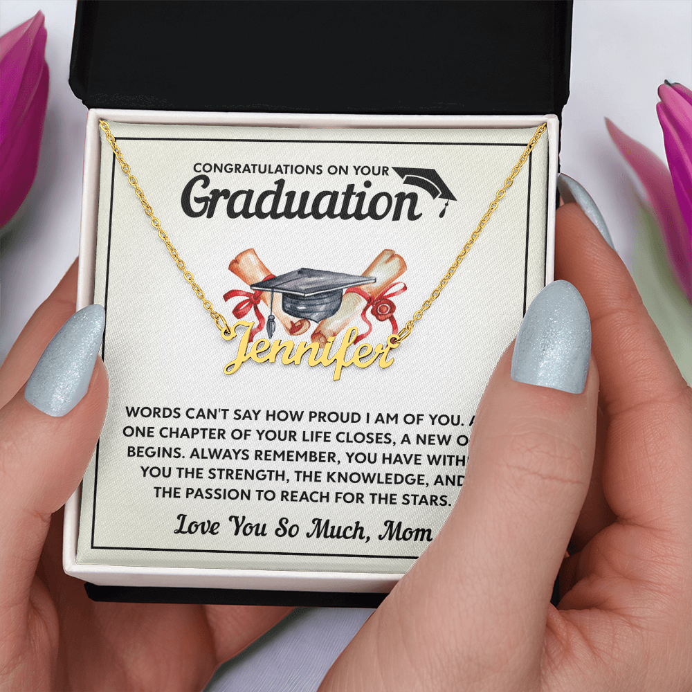 Discover the perfect graduation gift with custom name necklaces for women. Elegant designs made to honor the special bond between mothers and daughters on their big day.