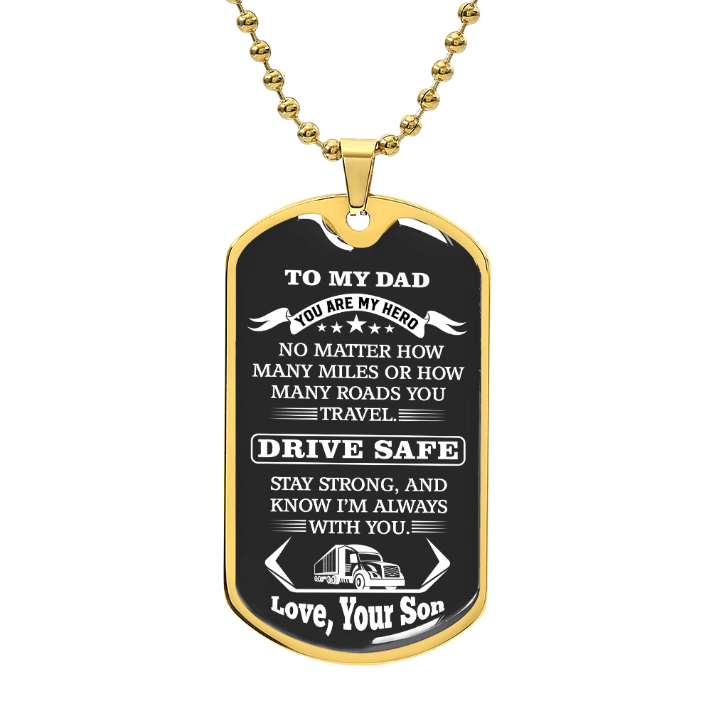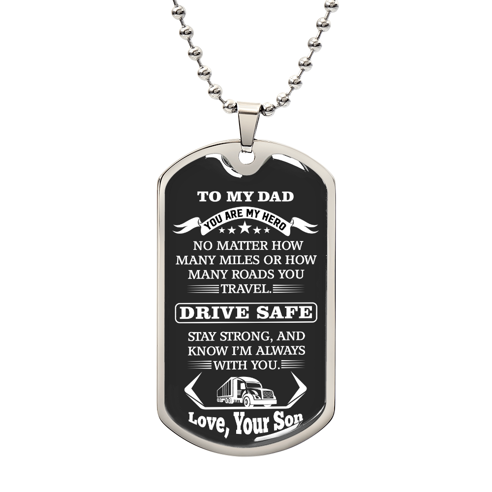 Honor your Truck Driver Dad, your hero, with this dog tag necklace. The best jewelry gift from son or daughter for birthdays, Father’s Day, or to celebrate his dedication and strength.